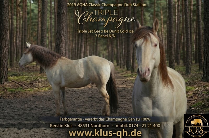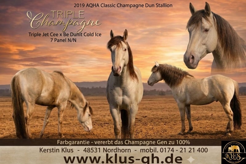 Triple Champagne 7 Panel n/n Stockmass: 150 cm ICE hat eine Top Charkter. Hat einen typvollen Body, und gute Hufe. Farblich ist er ein Classic Champagne. Er ist homozygot Champagne, es gibt also eine Farbgarantie auf ein champagne farbendes Fohlen. Er deckt bei uns im Natursprung. ICE wurde angeritten und darf im Offenstall leben. Möchten sie weitere Infos? Zögern sie nicht , nehmen sie Kontakt auf. Deckbedingungen: aktuelle Tupferprobe Haftpflichtversicherung hinten keine Eisen Ice deckt 2026 im Natursprung. Die Buchungsgebühr beträgt 280 Euro Wird nicht auf die Decktaxe angerechnet. Die Decktaxe: Quarter/ Paint 500Euro ZSSE und andere Rassen 400 Euro Es gibt eine Lebendfohlengarantie fürs darauffolgende Deckjahr.
