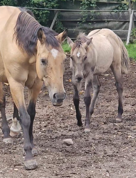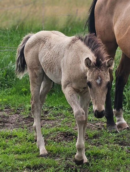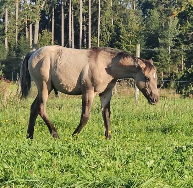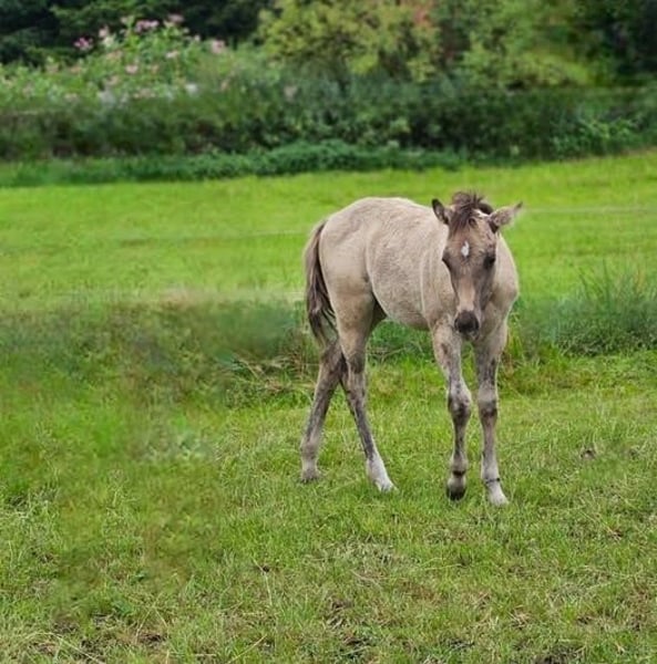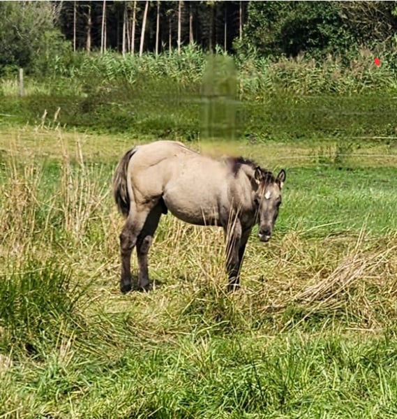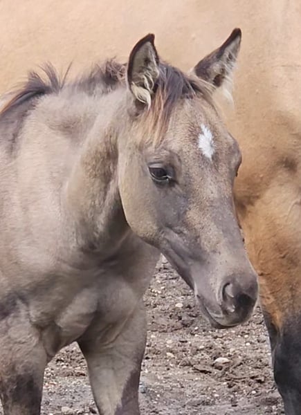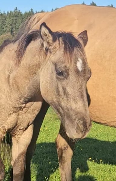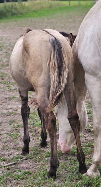 Ruf In Vegas NM - lustiges Quarter Horse Hengstfohlen, 4.25 geboren, mit einem Endmaß von 145 cm, mit traumhafter Abstammung und mega Bewegungspotenzial. Henry ist ein echtes Kracherfohlen. Er überzeugt mit seiner Traumfarbe (dunskin, homozygot schwarz: EE Aa CRn Dnd2)), seinem zutraulichen, menschenbezogenen Charakter, seinen mega Bewegungen und seiner erstklassigen Abstammung. Vom Gebäude her ist er ein sportlicher Typ. Frei laufend zeigt Henry viel Talent. Das Fohlen wächst mit Gleichaltrigen in der Herde auf. Wird mit bestem Kraftfutter und Mineralien versorgt und ist bei Abgabe altersgemäß entwurmt und geimpft. Kennt dann das Fohlen ABC. Der Kleine genießt beim täglichen Umgang seine Krauleinheiten. Henrys Vater ist der erfolgreiche QH Hengst High Roller Whiz (LTE: 127.000$). In Henrys Pedigree findet man Topsail Whiz, Smart Chic Olena, Lil Ruf Peppy und Tejons Peppy Doc. Gerne kann er zur Aufzucht bleiben.