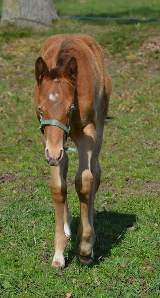 Poulain stallion Amber Champagne, qui atteindra une taille finale d'environ 1,54 m.
