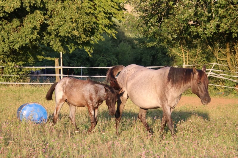 Just Be Blue Sky - dieses bildhübsche Quarter Horse Hengstfohlen, geboren am 9.4.2025, beeindruckt in der auffälligen Farbe Blue Roan und wird voraussichtlich ein Endmaß von 150 bis 154 cm bekommen. Blue ist über seine Eltern 5-Panel n/n. Er wächst gesund und artgerecht im Herdenverband mit anderen Fohlen auf. Bei Abgabe wird er altersgemäß geimpft und entwurmt sein. Kennt dann den Tierarzt und den Hufschmied. Mit seinem lieben Charakter verzaubert er die Umwelt. Ist verschmust sowie cool und erkundigt gerne seine Umwelt. Blue wird täglich gehändelt und benimmt sich dabei brav und unkompliziert. Beim Toben zeigt er jetzt schon seine tollen Bewegungen. Dank seiner guten Allround Abstammung wird er sich voraussichtlich sehr gut für den Sport oder/und als treuen Freizeitbegleiter eignen. Wird mit vollen AQHA Papieren und Equiden Pass abgegeben.