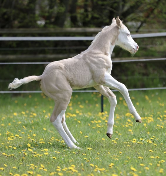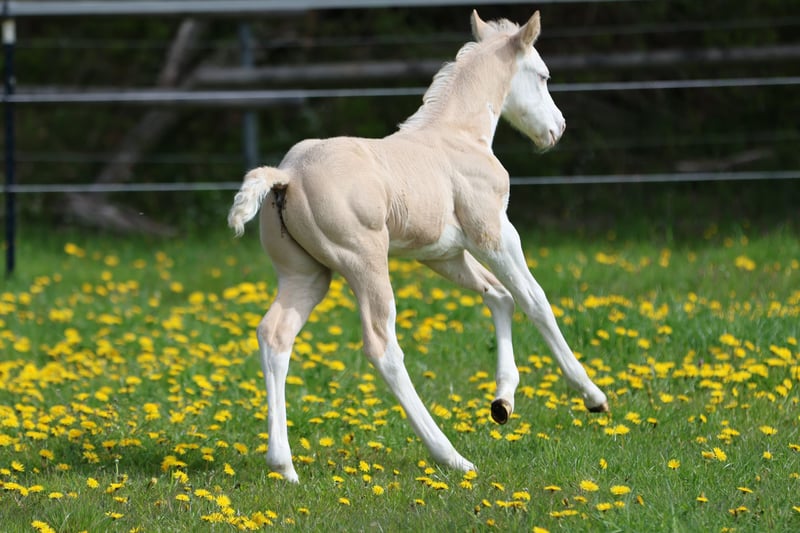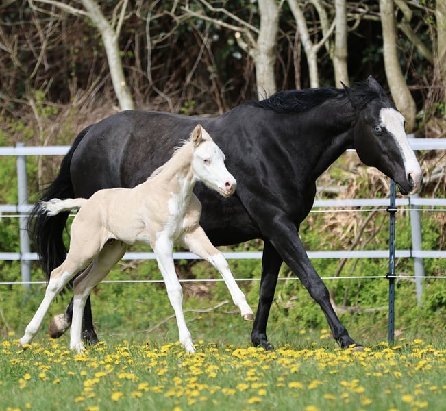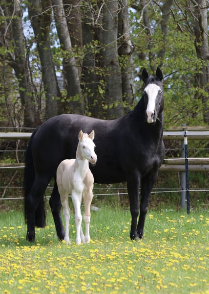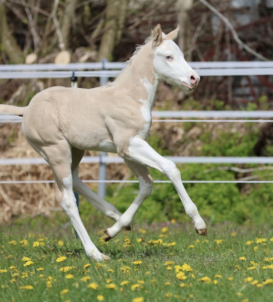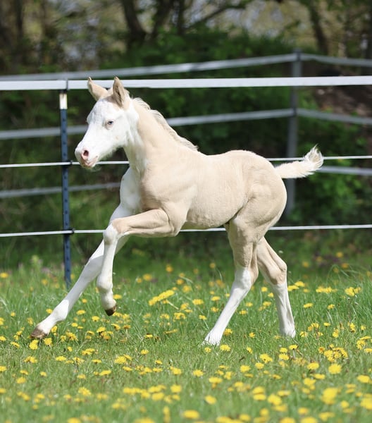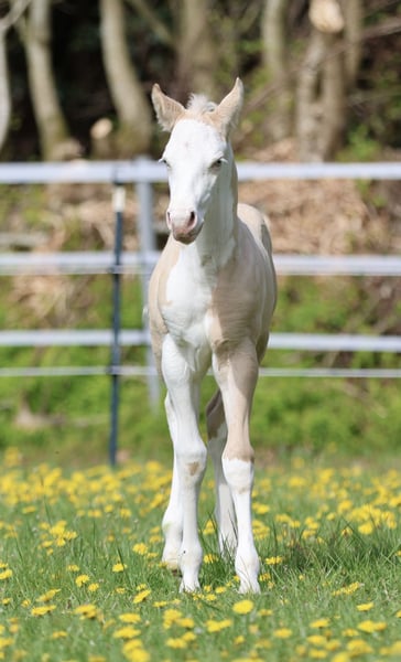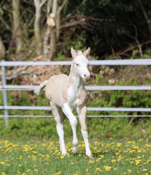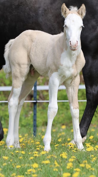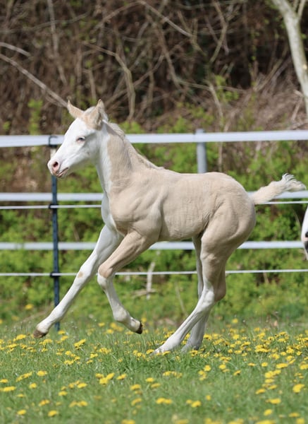 Bodie – Ein besonderes Hengstfohlen in der schönen Farbe Dunalino Splash White (ee aa Dd Crcr SW1 SW2) mit zwei blauen Augen. Am 23.04.25 hat er das Licht der Welt erblickt. Bodie begeistert nicht nur durch seine seltene Farbe, sondern auch durch sein kräftiges Gebäude, schöne Bewegungen und sein offenes, neugieriges Wesen. Er zeigt sich jetzt schon sehr menschenbezogen und aufmerksam, beste Voraussetzungen für eine vielversprechende Zukunft! Sire: Shining C Amar Amar stammt aus der weltbekannten Zucht von Cassidy Huckeba, Shining C Grulla Horses und wurde 2019 aus Texas importiert. Vollbruder zu: Splash in Diamonds – 2018 APHA World Championship Show, Top 5 Junior Working Cowhorse as a 3 year old Dam: Black Guns Please Blueys Mama ist ebenfalls aus den USA importiert und eine Tochter von No Guns Please. 2001 AQHA stallion by Chic Please out of the legendary mare, Katie Gun! LTE $25,000+, 337+ AQHA Points in Reining, Cow Horse, Heading, Heeling, and Tie-Down roping. Er erhält Papiere der AQHA & APHA sowie einen DQHA-Pass. Bodie ist selbstverständlich 7-Panel negativ. Er wächst artgerecht im Herdenverband auf, kennt das Fohlen-ABC beim Auszug und wird regelmäßig entwurmt, mit hochwertigen Mineralien versorgt und dem Hufschmied vorgestellt. Die Fotos zeigen ihn nur wenige Stunden nach der Geburt, wer ihn live erleben möchte, ist herzlich eingeladen, vorbeizukommen und sich selbst ein Bild zu machen!