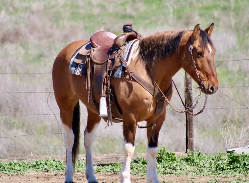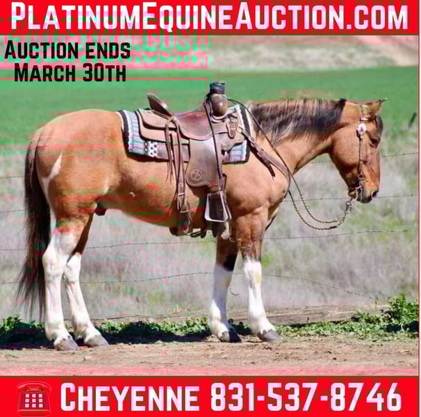 ONLINE AUCTION Place your bids at www.PlatinumEquineAuction.com Starting Bid $3500 Auction ends March 30th, 2025 Need a new saddle? Check out White Rock Saddles on our website or Facebook! Boogie is an eye catching, 14.2HH dun paint gelding at just 9 years old, he has many miles left to travel! Boogie is a certified ranch horse, he’s been out long miles looking for cattle, he will cross anything out on the trail, he has a great medium pace to him, and will travel the trails all day long. You can open and close gates from his back, sort cows, and do anything you need to. He has been branded off of and rope some outside too. boogie is most comfortable out in the countryside, doing a job for his rider! In the arena, he is very user friendly. He knows both leads, has smooth easy gaits, and a soft feel in the bridle. He carries his head collected. Moves off one handed direct rein, as well as leg pressure. He has impeccable ground manners, stands tied, good for farrier, bathing and will let you clip his face. He will load up into a two horse straight load, effortlessly. Boogie is an outstanding little horse, ready to continue his ranch work job, or he would be a great prospect to go into the rodeo world, I could see him being a great team roping, or breakaway horse! Boogie is located in Bitterwater, CA. for more info, or to schedule a visit with him, contact Cheyenne Rey 831-537-8746. ONLINE AUCTION Place your bids at www.PlatinumEquineAuction.com Starting Bid $3500 Auction ends March 30th, 2025 Need a new saddle? Check out White Rock Saddles on our website or Facebook!