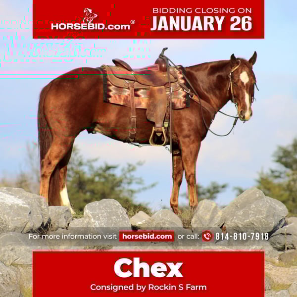 𝐉𝐀𝐍𝐔𝐀𝐑𝐘 ⭐️𝑨𝒍𝒍 𝑺𝒕𝒂𝒓 𝑳𝒊𝒏𝒆𝒖𝒑⭐️ Happening now thru MONDAY | JANUARY 26th - Available EXCLUSIVELY on HorseBid's website! For more details and to register visit: www.Horsebid.com CONSIGNOR CONTACT: Rockin S Farm 814-810-7918 LOCATION: Rebersburg, PA BREED: Quarter Horse REGISTERED: Yes REGISTERED NAME: Chex COLOR: Sorrel HEIGHT: 14.3 AGE: 10 GENDER: Gelding 🔥Chex🔥🔥 Wow what a cool dude! And a money earner at the local shows in reined cow horse, he also has extensive reining training and has experience in a types of ranch work including: roping pasture cattle and the feed yard, dragging calves to the fire, and roping and doctoring calves, yearlings, he will rope either end as well as pasture rope or doctor cattle, Chex is a been there and done that type of guy yet is not complicated to ride he's the type that you can go show him and come home and go trail riding Chex has won ranch and trail classes at local fairs and events, he will do any obstacle course you show him. Chex is a handsome trail partner and will ride out alone or with a group, he's ok with leading or following and is not barn or buddy sour, we've exposed him to tarps and the bouncy ball and he will proudly carry the flag He's also super fancy arena horse and knows his leads, he will also do flying lead changes and has a Smooth walk-trot-canter and sure is fun to ride He has the best of barn manners and gets along well with other horses, the children can get him out and brush him by themselves, he trailers great and hauls with no issues, Chex has been our go to horse and is ready to move to his new home, he is up-to-date on farrier and dental as well as a current Coggins and health certificate, he has not had any outside exposure to the latest outbreak, if you have any questions please feel free to call Sam 814-810-7918 We are happy to assist in arranging transportation anywhere in the US