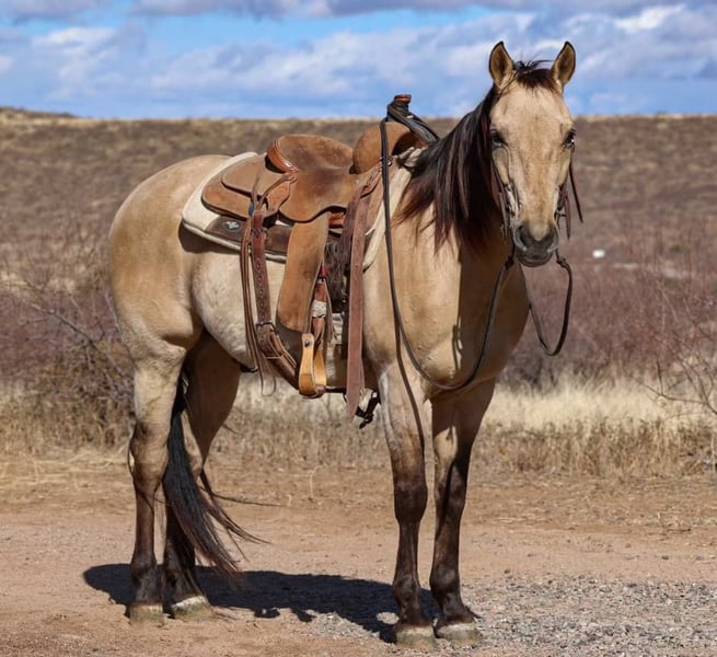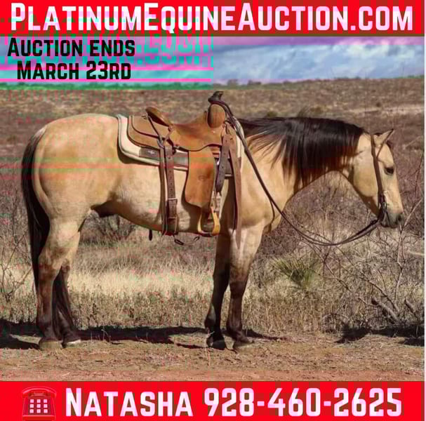 ONLINE AUCTION Place your bids at www.PlatinumEquineAuction.com Starting Bid $3500 Auction ends March 23rd, 2025 Need a new saddle? Check out White Rock Saddles on our website or Facebook! If you’re looking for an absolute gentleman in every possible way, then look no further!!! Charlie is a 9 year old grade gelding standing 14.3hh. This gorgeous gelding is well mannered, gentle, safe, good minded, and BROKE! Whether you’re seeking a surefooted gelding to take you on your next adventures on the trail, or an absolute dream to ride in the arena, Charlie is your guy!! Charlie will walk, trot and lope both ways on a draped rein with ease, has a fancy neck rein, great stop, and a flawless sidepass. You can even ride him bridless and bareback!! This gelding isn’t just fancy broke in the arena, but magnificent on the trail as well!! Charlie will go absolutely any direction you point him with zero spook and never in a rush. Flowing waters, fallen logs, thick brush, up and down steep terrain, rough rocky country, you name it and Charlie will go through it without batting an eye!! Charlie would suit absolutely any level rider from beginner to experienced, from 5 years old to 85 years old. This once in a lifetime gelding would excel in any direction you decide to take him!!Charlie is easy to catch and good to groom, saddle, bridle, bathe, clip, shoe, and load! Will come with a clean coggins and health! Transport can easily be arranged anywhere in the US!!! Located in Camp Verde, AZ. D/C Equine Services Dallas 804-822-2233 or Natasha 928-460-2625. ONLINE AUCTION Place your bids at www.PlatinumEquineAuction.com Starting Bid $3500 Auction ends March 23rd, 2025 Need a new saddle? Check out White Rock Saddles on our website or Facebook!
