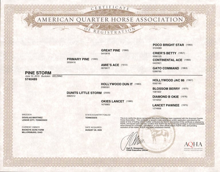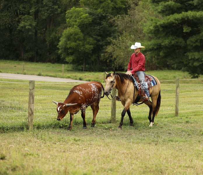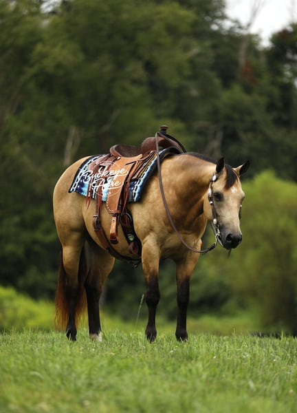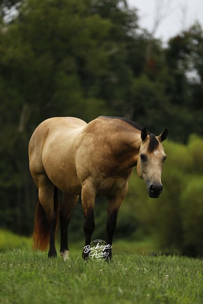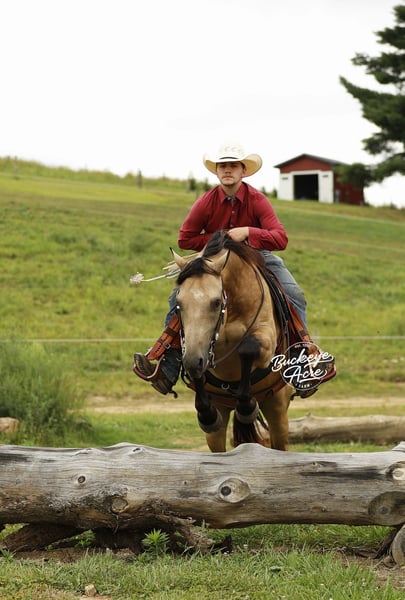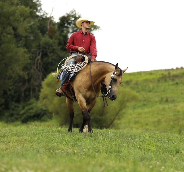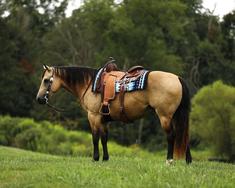 Wow, wow—we feel truly privileged to be able to offer you this outstanding individual! Lambo is a 2015 model standing at the near-perfect size of 14.3 hands. With his rich dappled buckskin coat, black mane and tail, and a single white hind sock, he is as eye-catching as they come. His balanced conformation, pretty head, bright eye, and smart mind check every box you could want in your next partner. Lambo is no stranger to the outside world—he has been safely ridden on busy state roads in traffic and handles it all with confidence. No matter where you take him, he is sure to turn heads. One of the things we love most about him is that he does not need a steady riding program to stay the same trustworthy partner—saddle him up after time off, and he is just as dependable as the last time you rode. This gelding is stout, sure-footed, and built for the trail. He has been ridden for countless miles, crossing creeks and rivers, stepping over downed logs, navigating steep hillsides, and making his way down the other side with ease. He takes everything in stride, never in a hurry, always steady, and happy to be out with you. Under saddle, Lambo is a pleasure. He has an exceptionally good one-hand neck rein, side passes to the mounting block, knows his leads, and even offers a lead change. His smooth gaits will keep you smiling all day, whether you are enjoying a long ride on the trail or just loping circles in the arena. When it comes to obstacles, Lambo is seasoned and confident. He has been exposed to tarps, whips, jugs, and even gunfire without issue. He is the type of broke that makes him suitable for anyone—whether you are a beginner, a senior rider, or an advanced horseman, Lambo is quiet, dependable, and safe in every way. In the barn, he is just as much of a gentleman. Easy to handle in the wash bay, pasture, and with the farrier, he loves every bit of attention and scratches you are willing to give. Lambo has the kind of personality that makes him truly special, he is not just a horse to ride, but a companion that really wants to be your best friend and he is ready to be your once-in-a-lifetime partner. If this sounds like the horse you have been looking for, do not miss the chance to make him yours. Feel free to reach out to Duane @ 330-231-2324 for more information or to schedule a day to see Lambo in person