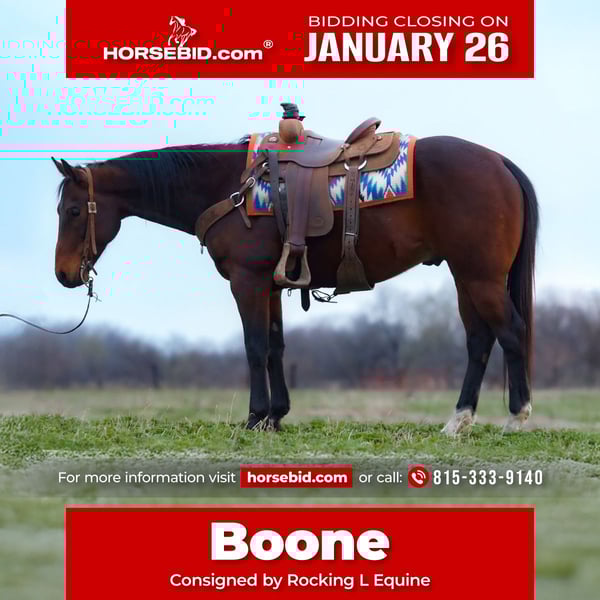 𝐉𝐀𝐍𝐔𝐀𝐑𝐘 ⭐️𝑨𝒍𝒍 𝑺𝒕𝒂𝒓 𝑳𝒊𝒏𝒆𝒖𝒑⭐️ Happening now thru MONDAY | JANUARY 26th - Available EXCLUSIVELY on HorseBid's website! For more details and to register visit: www.Horsebid.com CONSIGNOR CONTACT: Rocking L Equine 815-333-9140 LOCATION: Joy, IL BREED: AQHA REGISTERED: Yes REGISTERED NAME: This Boogers popular COLOR: Bay HEIGHT: 15 AGE: 10 GENDER: Gelding 🔥 2016 AQHA Gelding – Finished Head Horse, All-Around Superstar 🔥 🌟 This Boogers Popular “Boone” 🌟 ✅ 15h | ✅ Gentle & Safe | ✅ All-Around Ranch & Roping Horse Boone is the kind of gelding that checks every box. He’s a finished head horse that leaves the box flat, scores like a rock, and has been hauled everywhere. He’s also breakaway trained, has doctored hundreds of cattle, and has dragged calves to the fire. Whether you need a solid, seasoned rope horse, a trusted ranch partner, or a gentle teacher for lessons, Boone does it all. 🏆 Roping & Ranch Work: ✔ Finished head horse – scores amazing, leaves flat, easy to handle ✔ Breakaway horse – quiet in the box, smooth and consistent ✔ Proven ranch horse – doctored cattle, dragged calves, works a rope ✔ Great teacher – used in roping lessons and beginner lessons 🐴 Personality & Rideability: ✔ No spook, buck, rear, or bolt – rides like a dream every time ✔ Trail rides anywhere – crosses water, logs, bridges, and thick brush with ease ✔ Beginner-friendly – safe for any level of rider ✔ Same horse every time – even with time off 🏡 Perfect Ground Manners & Care: ✔ No crib, no weave, easy keeper ✔ Stands tied, loads, bathes, clips, stands for the farrier & mounting block ✔ Easy to catch in the pasture, gets along with everyone – never starts a fight ✔ Sweet, willing, eager to please – a true gentleman 💉 Current on everything: ✔ Vaccines ,dental & coggins up to date ✔ Sees the farrier every 6 weeks ✔ Full set of clean X-rays If you’re looking for a finished rope horse that’s safe, seasoned, and versatile, Boone is the one. He’s ready to take you to the pay window, go to work on the ranch, or safely teach your kids how to ride.
