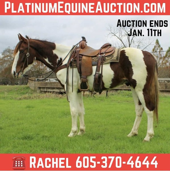 ONLINE AUCTION Place your bids at www.PlatinumEquineAuction.com Starting Bid $3500 Auction ends January 11th, 2025 Need a new saddle? Check out White Rock Saddles on our website or Facebook DJ is a 10 year old gaited/QH cross, he stands 15.1 hands tall and is gentle and quiet to be around! DJ has a nice easy going walk outside and is very willing to go anywhere he is asked! He has been trail rode all over, crosses the creeks, logs and goes through the brush with no issues. He has been hauled to large group trail rides and does good anywhere in the group! DJ has also been used for basic aspects of ranch work such as gathering and penning cattle! He is an easy going gelding that is safe and quiet for the whole family! Located in Rusk, TX. Contact Rachel with TR Livestock 605-370-4644 with any questions. ONLINE AUCTION Place your bids at www.PlatinumEquineAuction.com Starting Bid $3500 Auction ends January 11th, 2025 Need a new saddle? Check out White Rock Saddles on our website or Facebook