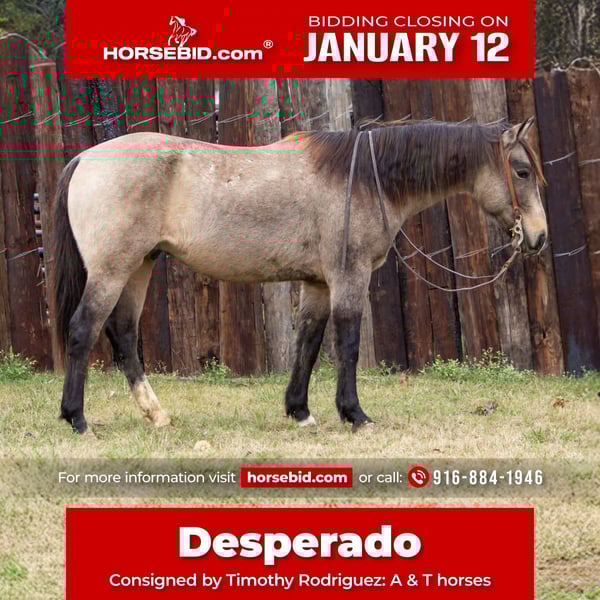 ♦️𝐍𝐄𝐖 𝐘𝐄𝐀𝐑'𝐒 𝑬𝒙𝒕𝒓𝒂𝒗𝒂𝒈𝒂𝒏𝒛𝒂♦️ Happening now thru MONDAY | JANUARY 12th - Available EXCLUSIVELY on HorseBid's website! For more details and to register visit: www.Horsebid.com CONSIGNOR CONTACT: Timothy Rodriguez: A & T Horses 916-884-1946 LOCATION: Palmer, TX BREED: Qh REGISTERED: No REGISTERED NAME: Desperado COLOR: Buckskin HEIGHT: 15.1 AGE: 10 GENDER: Gelding Meet our incredible 10yr old buckskin gelding named Desperado. Standing at 15,1 hands, he’s built to last with lots of bone and a huge heart that’ll go all day long for you! This versatile and extremely athletic horse has done it all: ✅Ranch Work ✅Trail Riding ✅Traffic safe ✅Not Spooky Whether you need a reliable partner for ranch chores or a steady companion for trail adventures, he’s your guy. Desperado will cross anything you ask him to. He has no spookiness to him and has taken everything we’ve thrown at him in stride! We’ve taken him to town and he isn’t rattled by the cars, Christmas lights, or local joggers! He just keeps a cool calm attitude. Coming off a huge ranch in AZ he’s known for being super athletic in the sorting pen. He gets any job done, weather it be gathering, sorting or doctoring pairs he’s a saint with it all! Desperado is extremely cowy and alot of fun. His experience and athleticism make him a perfect fit for any rider that is looking for a dependable and hardworking horse. Desperado one of a kind to ride and look at! He neck reins nicely and carries himself with such grace, I can’t help but think he would great as an English horse! Desperado is easy to catch, blanket, bathe and hauls like a dream! He will back out or turn around in any trailer! This a sweet gelding with a kind eye that aims to please 365 days a year! Folks don’t miss out! He’s sound with zero maintenance, his kind are hard to find!