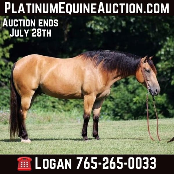 ONLINE AUCTION Place your bids at www.PlatinumEquineAuction.com Starting Bid $3500 Auction ends July 28th, 2024 Need a new saddle? Check out White Rock Saddles on our website or Facebook! Talk about a dreamhorse… Atlas is one of a kind! He checks all of the boxes, he has the color, the looks, the ride but most importantly he has the right mind! Atlas is a super stout built Golden Buckskin Gelding, standing around 15.1hh and he is 8 years old. Atlas has been used on a feedyard in Texas to around cattle, pasture roped and used to doctor as well. I have ridden down the highways, through subdivisions and he is safe around lawn mowers, all types of traffic and he is not spooky when dogs or kids come running out by the road. Atlas is great on trails and he will cross creeks, ditches, logs and navigate rough rocky areas. He is not scared of any wildlife that he meets and handles any situation that comes at him. He has a smooth jog, lopes around good and stops with ease. He is a gentle, laid back type of horse that is not in a hurry and he loves attention! Located in Level Green, KY. Feel free to call Moore Trained Horses Logan 765-265-0033 with any questions. ONLINE AUCTION Place your bids at www.PlatinumEquineAuction.com Starting Bid $3500 Auction ends July 28th, 2024 Need a new saddle? Check out White Rock Saddles on our website or Facebook!