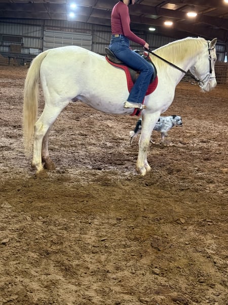 🎄𝐓𝐇𝐄 𝑯𝒐𝒍𝒊𝒅𝒂𝒚 𝐂𝐋𝐀𝐒𝐒𝐈𝐂🎄 Happening now thru MONDAY | DECEMBER 15th - Available EXCLUSIVELY on HorseBid's website! For more details and to register visit: www.Horsebid.com CONSIGNOR CONTACT: Florinia Equine 572-205-5282 LOCATION: Guthrie OK BREED: Aqha REGISTERED: Yes REGISTERED NAME: Fire n Gold COLOR: Cremello HEIGHT: 15.1 AGE: 9 GENDER: Gelding 🦄✨ PHANTOM – 9-Year-Old Cremello Gelding • The Unicorn Everyone Wants but Rarely Finds ✨🦄 If you’ve been waiting for THAT once-in-a-lifetime, heart-of-gold gelding… meet PHANTOM. This 9-year-old cremello gelding is the kind of horse people search years for. His unique golden coat, snow-white mane and tail, and icy blue eyes make him unforgettable—but it’s his mind, manners, and miles that make him a true unicorn. 🧒 Bombproof • Kid Horse Deluxe • Confidence Builder Phantom is as steady and safe as they come. He has been ridden by kids, beginners, guests, and anyone who needs a worry-free mount. He never overreacts, never rushes, never gets hot. He is a true “point-and-go” gentleman who takes care of his rider every single time. 🐎 Steady Eddy • Trail Veteran Phantom has hauled thousands of miles to overnight rides, big group trail outings, and new places. He is calm, level-headed, and sure-footed in every situation. Water, bridges, mud, wildlife, steep terrain—he simply does his job without hesitation. He truly is your Steady Eddy anywhere you take him. 🏇 Versatile – English, Western, or Just for Fun Ride him Western on the trails, throw English tack on him for lessons, pony kids around the yard, or just enjoy him as your all-around family horse. He’s the type that can do anything you ask: ride out alone, follow a group, poke around the arena, or just be the safe, dependable partner everyone wants. 🚙 Hauls Like a Dream Phantom loads and unloads like he’s been doing it his whole life—because he has. He stands tied, handles busy campgrounds with ease, and has been on countless overnight rides. He’s the horse that makes traveling easy. 🦶 Barefoot & Built Right He is barefoot with excellent feet—no shoes required. He stands quietly for the farrier and stays sound and solid on all terrain. 🤝 Perfect Manners – 24/7 Phantom is polite, quiet, and gentlemanly in every moment. Easy to catch, saddle, bridle, groom, bathe, clip—he is the same horse every day, in every situation. 🦄 Horses like Phantom don’t come along often Safe, seasoned, stunning, and unbelievably dependable—Phantom is the kind of gelding families hand down through generations. If you want a horse with the brain, looks, and heart of a unicorn… Phantom is waiting to be your once-in-a-lifetime partner.