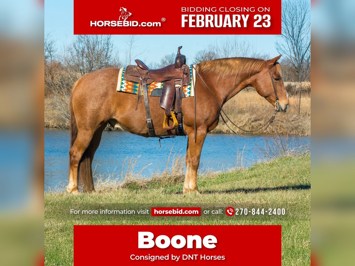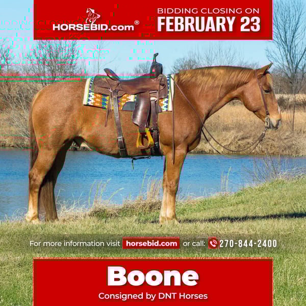 💎 𝐓𝐇𝐄 𝓓𝓲𝓪𝓶𝓸𝓷𝓭 𝐒𝐇𝐎𝐖𝐂𝐀𝐒𝐄 💎 Happening now thru MONDAY | FEBRUARY 23rd - Available EXCLUSIVELY on HorseBid's website! For more details and to register visit: www.Horsebid.com CONSIGNOR CONTACT: DNT Horses 270-844-2400 LOCATION: Henderson, KY BREED: Quarter Horse REGISTERED: No REGISTERED NAME: Boone COLOR: Red Roan HEIGHT: 15.1 AGE: 10 GENDER: Gelding Boone is a 10yr old red roan gelding standing 15.1 hands tall and built like a mac truck. He is as wide as he is tall. Boone stands quietly, loads and unloads easily on and off trailer, bathes, and stands like a gentleman for the farrier. If you’re looking for that calm, cool, honest, collected and will take care of you type of horse then Boone is you man! There isn’t much he hasn’t seen or done, with a resume a mile long he has been hauled all over the country and has dabbled in a little bit of everything. Boone has been ridden on many trails and has seen the sites with different terrain, he has done ranch work, roped some big bulls, gathered cattle, sorting, loading trucks, checking fences, rode in the grand entry at rodeos, pushed the longhorns at the stockyards in Fort Worth TX and been ridden in parades. Boone is just a jack of all trades with no job or trail too big or small for him. He genuinely loves having a job and taking care of his owner. He licks his lips every time you ask him to do something. When the work is done, Boone switches gears into a trail horse deluxe. He is absolutely a blast to ride out on the trail he will cross whatever you put in front of him and point him at. He doesn’t care how deep the water, bridges, big logs, steep ditches he will make you rethink your life choices-he crosses them all while taking care of his rider the entire way. He rides down the trail on a loose rein and low headed. He rides out alone or in a group and it doesn’t matter to him if he is in the front, middle or back he’s just happy to be out riding. Boone is super broke, one hand neck rein, soft in the bridle, he will walk, trot, and lope perfect circles on a loose rein always picking up the correct leads. He will side pass to open and close gates and stops off your seat just sit and say whoa and be ready for him to stop. He can go right back to work or hit the trails; it honestly doesn't matter to him as long as he gets to go along. Boone isn't just a horse, he's the kind that makes long days shorter, hard jobs easier, and trail rides better. If you're looking for one you can trust and count on... Boone might just be your guy. Boone is a sweet in your pocket type of guy that loves having all the attention you want to give him. He gets along with others in the pasture and will stall great as well. If you have any questions about Boone, feel free to reach out to Tasha at 270-844-2400. We are located in Henderson KY and if you need help with transport don’t hesitate to ask, we have a list of reputable haulers that can get him safely to your doorstep worldwide. Don’t let this amazing gelding get away from you if you want something big, beautiful, honest and dependable!