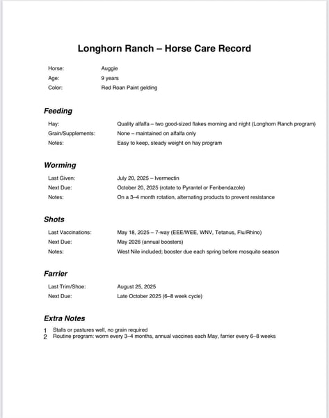ONLINE AUCTION Place your bids at www.PlatinumEquineAuction.com Starting Bid $3500 Auction ends September 21st, 2025 Need a new saddle? Check out White Rock Saddles on our website or Facebook Auggie The red roan paint with all the cool buttons! Some horses are ordinary. Auggie is not. This 9-year-old, 15.1-hand red roan paint gelding carries himself with the kind of presence that makes people stop mid-conversation just to watch him go by. He’s the one that doesn’t just fill a stall — he fills a page in your story. Step on and you’ll feel the difference. Auggie is broke with all the fancy buttons — spins, side passes, lopes off soft and collected — and he does it all with that stylish, ground-covering way of traveling that makes a real horse. He’s sharp enough for the arena, forgiving enough for the weekend rider, and honest enough to suit both. Trail miles? He’s got them. Water crossings, rocky hills, downed logs, and brush — Auggie moves through it all with confidence. He’s been down the road in traffic, handled flags, tarps, bridges, pool noodles, and tires. He doesn’t spook, doesn’t question, just carries on like the seasoned partner he is. What sets him apart isn’t just the training — it’s the way he makes everything feel easy. Whether you’re cruising solo on a quiet trail, riding with a crew, or putting on a little show in the arena, Auggie gives you that blend of class, safety, and fun you rarely find wrapped into one horse. And when the saddle comes off, he’s the same gentleman on the ground — ties, bathes, hauls, stands for the farrier — no drama, no nonsense. Just a kind, steady gelding with a whole lot of flash. Auggie isn’t a “check-the-boxes” horse. He’s a remember-his-name horse — the kind you’ll be proud to lead out, proud to ride, and proud to keep. 📍 Longhorn Ranch – Paicines, CA 📞 Dina – 831-537-1915 ONLINE AUCTION Place your bids at www.PlatinumEquineAuction.com Starting Bid $3500 Auction ends September 21st, 2025 Need a new saddle? Check out White Rock Saddles on our website or Facebook