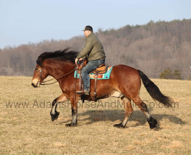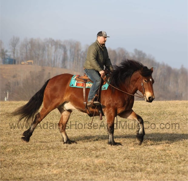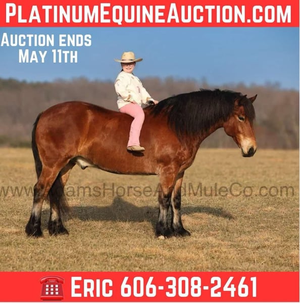 ONLINE AUCTION Place your bids at www.PlatinumEquineAuction.com Starting Bid $3500 Auction ends May 11th, 2025 Need a new saddle? Check out White Rock Saddles on our website or Facebook! Meet An Olympian, a super stout built Draftcross gelding that is standing around 16hh. He will weigh 1450lbs, he is 9 years old and he has all the good looks, the feathering and (the best part) the mindset that anyone could ask for! Not only does he look cool, he has all of the other boxes checked as well… he is Mr. Personality, as friendly as they come, loves attention and is very calm natured. We originally trained and sold Olympian back in early 2021 and he has made his home in Delaware ever since, until they decided to downsize. Olympian has been ridden by every member of our family all the way down to our 6 year old daughter. He has been ridden western as well as english, he has been over the jumps and around the dressage ring. He has been ridden down the highways and he is traffic safe as well. Olympian is great on trails and he will cross creeks, ditches, logs and navigate rough rocky areas. He has a smooth jog, a nice easy to set lope, a good stop and backs with ease! He has been exposed to all kinds of wildlife such as deer or turkey or other animals like cows or dogs and will go anywhere that he is asked too. He has been rode many miles in the mountains of Eastern Kentucky and encountered every obstacle possible on the trail. He will go up or down even the steepest slopes, across deep creeks, over downed trees, and over all types of rough terrain while still being sure footed. Olympian is not cinchy, cold backed, does not crib or weave. In addition to riding, Olympian has also been driven down the highways as well. He is a super cool horse that anyone is sure to love!!! Feel free to call Eric with Adams Horse & Mule Co. 606-308-2461 with any questions, to facetime, to make a Buy It Now Offer or to come see him in person in Mt. Vernon, KY. ONLINE AUCTION Place your bids at www.PlatinumEquineAuction.com Starting Bid $3500 Auction ends May 11th, 2025 Need a new saddle? Check out White Rock Saddles on our website or Facebook!