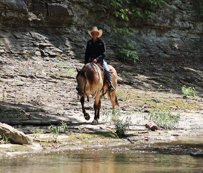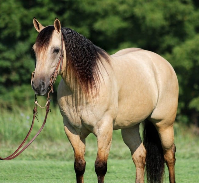 Colonel Doc Patron is consigned to the Best Of The West Horse Sale in Gladstone, NJ and will sell on September 27-28th. If you could put every ingredient that you wanted in a horse, into a blender and turn it on… when it got done I believe you’d have Doc! Doc is a 14.2H, 2016 Reg AQHA, gelding and check out that beautiful buckskin coat, his long wavy mane and the sweetest personality that you could ask for! Move on to the way he rides, loping nice circles, spinning around, slide stopping… he has the moves to go along with the good looks! Experience? Oh he has that too! From ranching to roping to trail riding he does it all and does it all right! Doc is great on the heel side, he is a good team sorting horse and he is more reliable than a 4×4 on the trails! Steep slopes, rocky terrain, creeks, logs, ditches… he crosses it all with ease! Doc is a laid back type of horse that is never in a hurry and is a horse that the whole family will enjoy and love for years to come! Feel free to call Eric 606-308-2461 with any questions! For more info go to www.AdamsHorseAndMuleCo.com