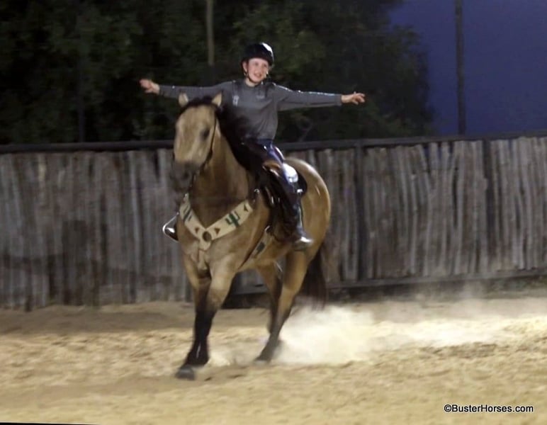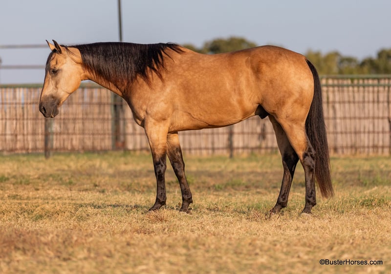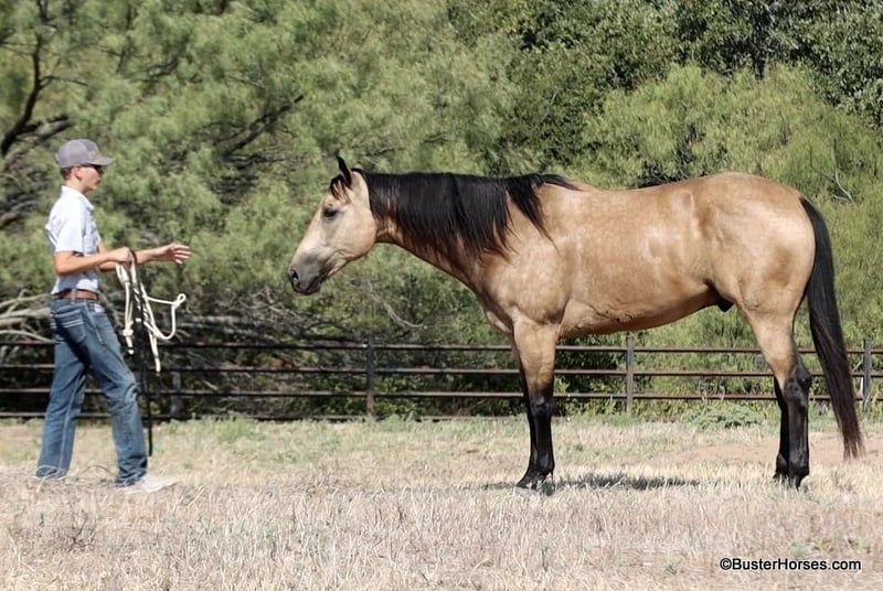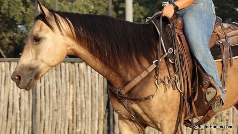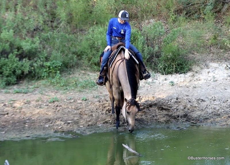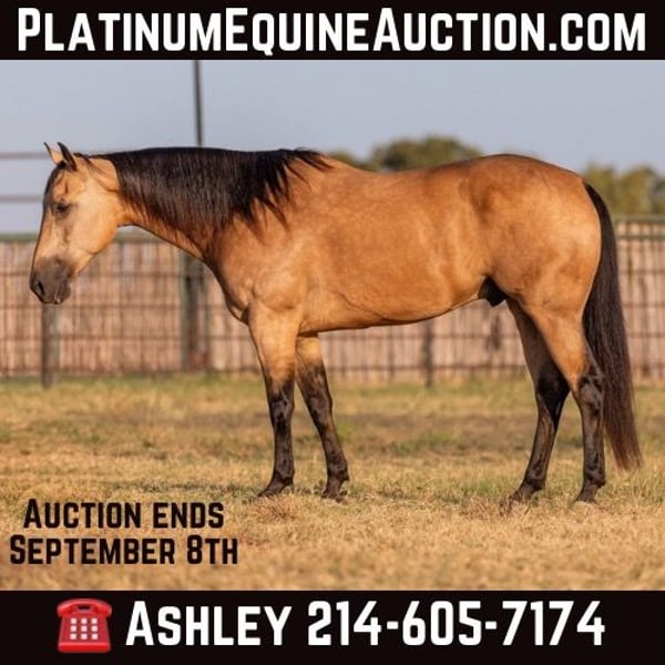 ONLINE AUCTION Place your bids at www.PlatinumEquineAuction.com Starting Bid $3500 Auction ends September 8th, 2024 Need a new saddle? Check out White Rock Saddles on our website or Facebook! “Hollywoods Playright” – 15.1H, 2016′ buckskin AQHA gelding. Hollywood is a GORGEOUS solid, safe, solid guy. He is the prime-age and ideal size that everyone is looking for and he is about as easy to ride as a horse comes. He has smooth, easy gaits, and that simple, one-hand, old-school ranch horse style handle that just about anyone can get alone well with! He is smooth at the walk and trot and incredibly soft and smooth to lope, very comfortable even for new riders. This guy is so pleasant to be around – everyone who has ever handled this horse or sat on him, absolutely adores him. He is relaxed, but still responsive, just a blast to ride. Hollywood has been used outside on a ranch and has been roped off of outside on the ranch, and also in the arena on the head side. Hollywood stands like a statue for mount and dismount and is so relaxed and easy going, he rides to your level and is happy just to cruise around if that is all you want to do! He is also willing to work and will glady trot and lope circles for just about any style and level of rider and naturally has a big stop and is really quiet and simple to guide around. We have used this guy for total beginners and also for riders just coming back from a bad experience and he is a great confidence builder and makes everyone feel right at home on his back. For advanced riders, he will ride up to your level and is very fancy broke and can be feely and responsive when asked to be. He is as pure as they get and very genuine – he stays together, honest, and rides around – even with his bridle off. He is very personable, sweet, and kind! Hollywood has been tons and tons of miles outside but has also been hauled to many events and acts like an old seasoned rodeo horse. He loves trail riding in a group, and is just as comfortable out alone with his rider. He enjoys hopping in the trailer and going to new places and he loves riding in traffic around town. Hollywood was just shod this week. His teeth were also just done by an equine dentist this past spring and at the same time he had his sheath cleaned, his ears preemptively treated for ticks, and he was also power packed wormed. Hollywood has great feet and goes really well barefoot – if his new owner prefers him to be barefoot, we can have his shoes pulled, prior to him heading to his new home. He will arrive at his new home up-to-date and ready to go to work! To see additional videos, go to our website: BusterHorses.com or our Facebook page Buster Horses. Please call anytime for more information at 214-605-7174 Hollywood is located in Weatherford, TX – one hour from Dallas / Fort Worth International Airport. He is an easy day trip or fun overnight trip to come try out, from anywhere! We are experienced, knowledgeable sellers, and we can help with quickly arranging affordable shipping to any buyer’s location – we have experience shipping worldwide – including regularly to Hawaii, Canada, Mexico, Europe, and South Africa. ONLINE AUCTION Place your bids at www.PlatinumEquineAuction.com Starting Bid $3500 Auction ends September 8th, 2024 Need a new saddle? Check out White Rock Saddles on our website or Facebook!