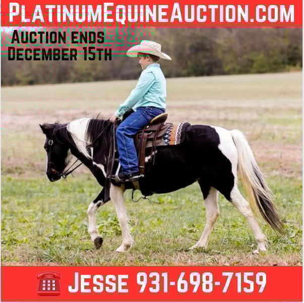 ONLINE AUCTION Place your bids at www.PlatinumEquineAuction.com Starting Bid $3500 Auction ends December 15th, 2024 Need a new saddle? Check out White Rock Saddles on our website or Facebook! If you are looking for the perfect kids ointment then look no further!!!! Oreo is a 9yr old quarter pony that’s as gentle and broke as they come. Oreo stands right at 50in tall and is built like a tank. The best feature that Oreo has is no matter how long you leave her off or turned out she’s just as broke whenever you decide to get her up and ride. She stands for the farrier, loves to be bathed, rides alone or in a group, will take lead or follow, and is SAFE!! If your little one has a problem getting on that’s no issue either due to her skill of standing to be mounted and use to a mounting block. Oreo cross water and logs with ease, no hill to steep, traffic safe, dog proof, and rope broke. Oreo is truly a once in a lifetime pony that’s will make some little cowboy or cowgirl extremely happy. Located in Santa Fe, TN. Contact Jesse Shouse 931-698-7159 with any questions. ONLINE AUCTION Place your bids at www.PlatinumEquineAuction.com Starting Bid $3500 Auction ends December 15th, 2024 Need a new saddle? Check out White Rock Saddles on our website or Facebook!