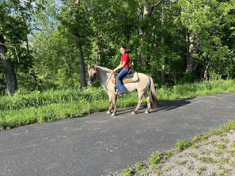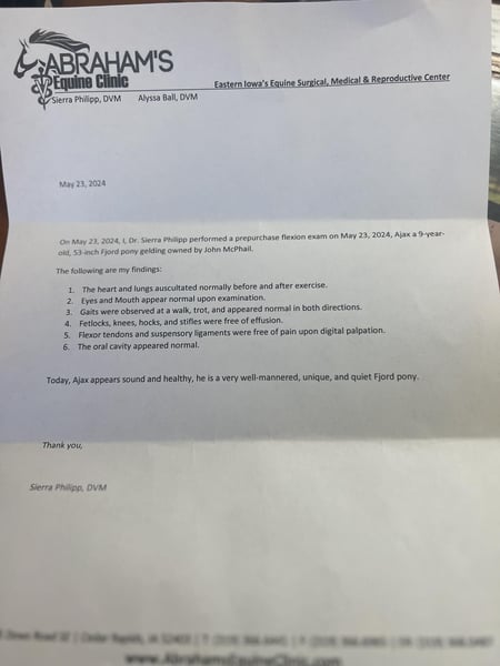 ONLINE AUCTION Place your bids at www.PlatinumEquineAuction.com Starting Bid $3500 Auction ends June 9th, 2024 Need a new saddle? Check out White Rock Saddles on our website or Facebook! Ajax is a 53” Grulla Fjord Crossbred Pony that is broke for anyone in the family to ride from grandkids to grandma. He has been ridden in parades, down multiple trails in multiple state parks. He has been to Eminence Missouri, Palo Duro Canyon, & the Canadian River. He is very reliable, safe and sound. He loves attention and he has gentle disposition. He does not spook from trains, cars, wildlife, tractors or skid loaders. He likes dogs and is easy to catch. Ajax has also been started in the harness. Ajax is a slow going, but very sturdy Pony he can carry a big person or a child. Ajax has been used for lessons in our summer camp. He stands tied to the Hitchin rail or all night sleepovers on camping trips. He loads and unloads with ease. He crosses anything including water, ditches, logs with no problem. He stands like a statue for the Farrier, or to be clipped and groomed. He is very trustworthy. He would never kick or bite. Ajax is up-to-date on all shots ,worming and dentistry. Ajax needs no maintenance or special care. He is a truly unique one of a kind Pony for any level of rider, he is truly a gentle soul, I have owned Ajax for a long time and have many pictures and videos of the whole family with him. Ajax gets along well in the herd with mares, gelding or other ponies. If you’re looking for a pony to ride once a month or every day he is more than willing, he never gets in a hurry and he never gets fresh. He is very reliable. Call John McPhail 319-721-7714 with any questions. Located in Lisbon, IA. ONLINE AUCTION Place your bids at www.PlatinumEquineAuction.com Starting Bid $3500 Auction ends June 9th, 2024 Need a new saddle? Check out White Rock Saddles on our website or Facebook!