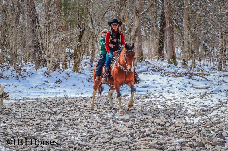 ONLINE AUCTION Place your bids at www.PlatinumEquineAuction.com Starting Bid $3500 Auction ends March 9th, 2025 Need a new saddle? Check out White Rock Saddles on our website or Facebook! This is “TOTANKA”, a super gentle, family friendly, and well trained BAY AND WHITE TOBIANO PAINT GELDING that is safe for the whole family. He has been ridden and shown by youth riders. He will lope nice circles, catch his leads, stop hard on whoa and back up. He willingly crosses streams and will travel over snowy and icy ground with confidence. This gelding will one step lope, one hand neck rein, and will not go any faster than asked of him. He rides double, triple, bareback, and in just a halter and lead rope. He loves attention, enjoys children, and is an easy keeper. He stands a stocky 14 hands tall and is 10 years old. He has excellent ground manners, can be handled by youth, and is also fine for novice and inexperienced adult riders. This gelding is stout enough to carry an adult rider and has good bone and feet. He is traffic safe, not spooky, and is a nice mover. He is the hard to find kind to come by. If you want a flashy family friendly paint gelding that the whole family can enjoy and love, don’t miss out. He has been around cattle and in the woods. If you’d like more info or want to make a Buy It Now Offer contact HH Horses Erin 304-238-4155 Located in Flemingsburg, KY. ONLINE AUCTION Place your bids at www.PlatinumEquineAuction.com Starting Bid $3500 Auction ends March 9th, 2025 Need a new saddle? Check out White Rock Saddles on our website or Facebook!