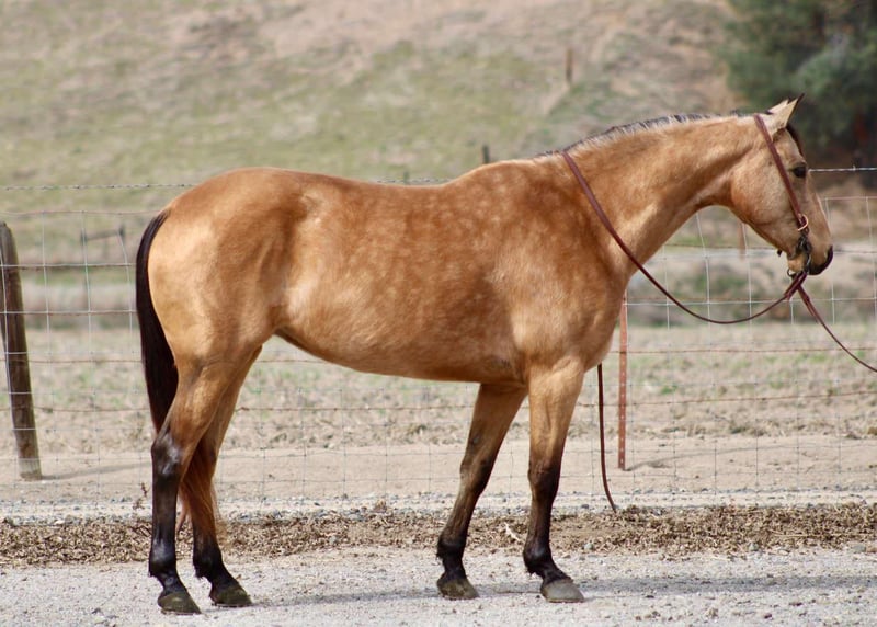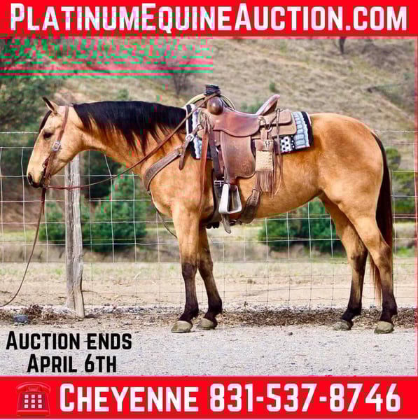ONLINE AUCTION Place your bids at www.PlatinumEquineAuction.com Starting Bid $3500 Auction ends April 6th, 2025 Need a new saddle? Check out White Rock Saddles on our website or Facebook! Dox Crystal Olena is a stunning like AQHA buckskin mare. She is coming 10 years old this June. Standing at a stocky 14.2HH, she can pack both kids and adults! Crystal is as cute as a button and such a user friendly horse. Crystal neck reins, has a great stop, is very responsive to both rein and leg cues, making her easy for both novice and advanced riders. She knows both leads, is easy to transition, and has that perfect medium pace. Crystal is just as smooth out on the trail as she is in the arena. She is very familiar with forest trails that are filled with bicycles, hikers, and other equestrians. She will go out alone, or in a group and is content anywhere in the pack. Crystal crosses rivers, bridges and brush. Will stay on those skinny hillside trails and keep up for hours! Crystal is safe and dependable, she does not get fresh, and is not a spooky horse at all. Flags, banners, and tarps aren’t a problem and she doesn’t mind them all over her. She has been hauled all over town and is easy to load in the trailer. Crystal has been exposed to heavy, loud traffic, and doesn’t have a care in the world. She’s been used to gather and move cattle as well. You can easily catch her out in pasture, or keep her stalled up in the barn. She stands quietly tied for tacking up, bathing, and is great for the farrier. You can clip her ears, face and legs no problem. Crystal is not a “marish” mare and gets along with all other horses, as well as other farm animals. With her mind, build, and demeanor she can go to a home in any discipline. She is located in Bitterwater, CA. Please contact Cheyenne Rey 831-537-8746 for any more info or make arrangements to come visit her! ONLINE AUCTION Place your bids at www.PlatinumEquineAuction.com Starting Bid $3500 Auction ends April 6th, 2025 Need a new saddle? Check out White Rock Saddles on our website or Facebook!