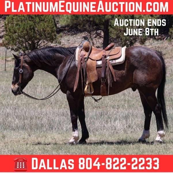 ONLINE AUCTION Place your bids at www.PlatinumEquineAuction.com Starting Bid $3500 Auction ends June 8th, 2025 Need a new saddle? Check out White Rock Saddles on our website or Facebook! Cruise is a 10 year old grade gelding standing 15hh, dense boned and rock footed!! If you’re looking for a been there, done that ranch gelding then look no further, Cruise is your man! He has done absolutely every single job around the ranch besides the dishes! Drug calves to the fire, doctored, loaded trucks, sorted in the alley, and rode countless miles of fence and rough country. This awesome gelding will be surefooted as can be no matter what kind of terrain you’re in, and will bulldoze through absolutely anything you throw in front him. Steep slippery slopes, rocky rough country, fallen logs, thick brush, flowing rivers, you name it and Cruise will bulldoze right through it. Cruise is not only great to ride outside, he’s a blast in the arena as well! He will walk, trot, and lope both ways easily picking up both his leads, has a great neck rein and a big stop. He’ll even carry a flag!! Cruise is easy to catch and good to groom, saddle, bridle, bathe, shoe, and load! Absolutely no buck or funny business. Moves with a sense of purpose ready to go do a job. Will come with a clean coggins and health! Transport can easily be arranged anywhere in the US!! Contact D/C Equine Services Dallas 804-822-2233 Located in Camp Verde, AZ. ONLINE AUCTION Place your bids at www.PlatinumEquineAuction.com Starting Bid $3500 Auction ends June 8th, 2025 Need a new saddle? Check out White Rock Saddles on our website or Facebook!