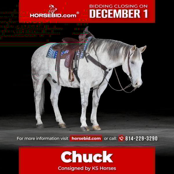 ⚜️ 𝓽𝓱𝓮 𝐇𝐨𝐫𝐬𝐞𝐦𝐚𝐧'𝐬 𝓢𝓱𝓸𝔀𝓬𝓪𝓼𝓮⚜️ Happening now thru MONDAY | DECEMBER 1st - Available EXCLUSIVELY on HorseBid's website! For more details and to register visit: www.Horsebid.com CONSIGNOR CONTACT: KS Horses 814-229-3290 LOCATION: Clarion, PA BREED: QH REGISTERED: No COLOR: Grey HEIGHT: 15 AGE: 11 GENDER: Gelding Chuck is a 11 Year Old Grey Dapple Quarter Horse Gelding. Standing 15 hands tall and stocky enough to carry any size rider but not to tall making him easy to mount and dismount. Chuck is that been there done that all around good broke safe gelding. Very quiet and gentle and easy to ride not complicated at all. Chuck is a finished ranch horse that can do all aspects of ranch work. Very seasoned when it comes to working cattle and handy to have around the ranch. The past year he has been used primarily as a family trail horse. Great on the trails and safe for the whole family to ride and build confidence with and grow with. If your a timid rider Chuck will help you build your confidence . You will love his easy one hand neck rein, smooth trot and lope, good stop and back up and side pass. Pull his bridle off and ride him with no bridle just a rope around his neck. If you want a been there done that super broke and super safe horse then be sure to check out Chuck!! We can help arrange delivery anywhere in the United States. Call or Text Glory at 814-564-2117. Thank You and God Bless