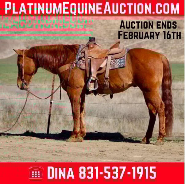 NLINE AUCTION Place your bids at www.PlatinumEquineAuction.com Starting Bid $3500 Auction ends February 16th, 2025 Need a new saddle? Check out White Rock Saddles on our website or Facebook! Amos, If you have been searching for that needle-in-the-haystack horse everybody is looking for, you have just found him! The horse that you can trust with your kids but also still able to do any task asked of him . Amos is a 10 year-old, right at 15 hands and is a beautiful dun gelding with big soft kind eyes and just the sweetest horse. When I say gentle… I Mean it there isn’t anything you can’t do off this horse! He is safe, safe, safe! Amos will go over bridges, tarps, tires, and through car washes all with no bridle; he’s so easy and pleasing. Amos will calmly walk down any trail, carefully walking over trees, deep cracks, and through water. He will take care of the smallest riders and build their confidence. He is one that grandma,grandpa,husbands can enjoy as well and still great for more experienced riders. He will walk slow and calm through town with cars and pedestrians with strollers, honking semis, and trains like he does it every day. Absolutely anyone can ride the horse be it your first time ever on a horse he will take care of you. This horse is just a fun and easy to enjoy he’s up for any challenge you through his way. Amos has a smooth lope in the arena and neck reins with ease, picks up his leads, has a nice stop, and a smooth backup. I can assure you this horse is one you will never find again; he is just the complete package. He has carried flags, tarps, and bouncy balls, dragged logs, and has worked cattle. He has branded and doctored many, so he knows the ropes. Amos handles time off and is easy to tack up, clip, bathe, and groom. He goes out alone or in groups where he will leave the group and ride off alone with no hesitation whatsoever. Amos is great in a pasture or stall setting and is the first to greet you at the gate. He absolutely loads in any trailer, and new places don’t bother this boy one bit. This horse is the one that you can take anywhere and feel confident he has your back in any situation. Truly a rare find, Amos has been everywhere, and you cannot surprise him. This is one of the safest horses we have ever offered, and we will stand behind this horse. percent! Please contact Longhorn Ranch, Located in Paicines, CA. Dina at 831-537-1915 to meet your dream horse. ONLINE AUCTION Place your bids at www.PlatinumEquineAuction.com Starting Bid $3500 Auction ends February 16th, 2025 Need a new saddle? Check out White Rock Saddles on our website or Facebook!