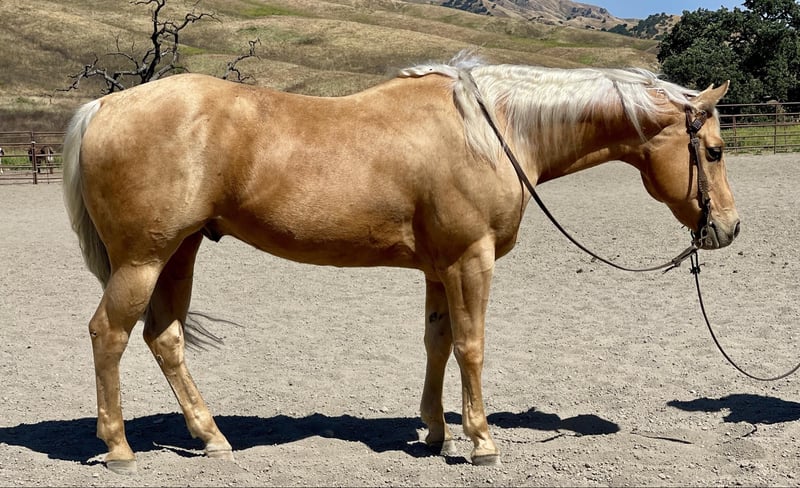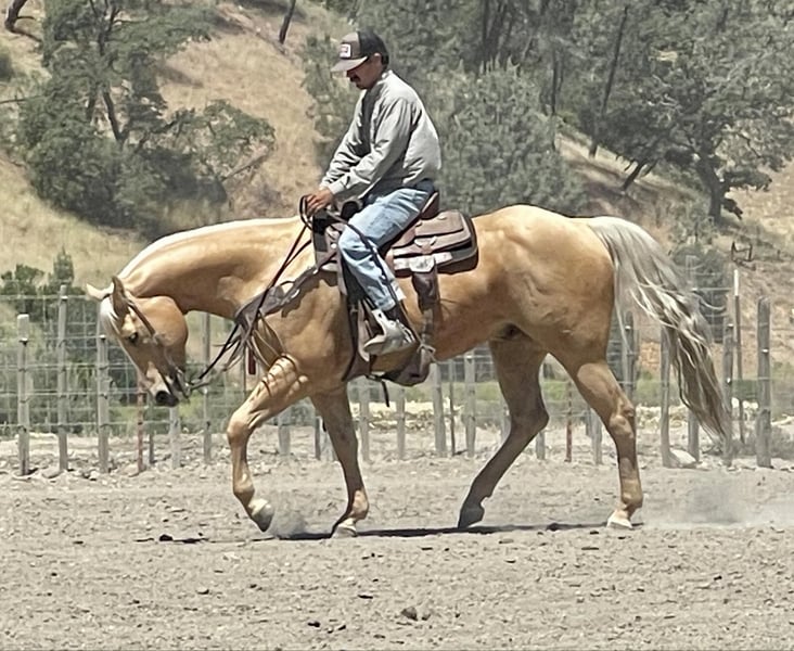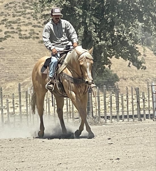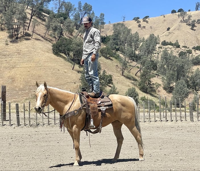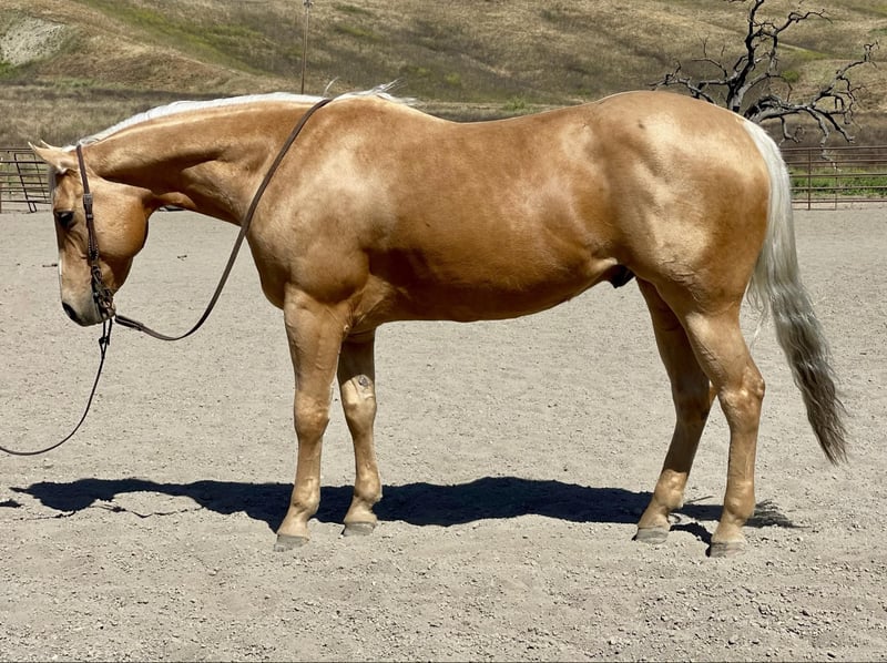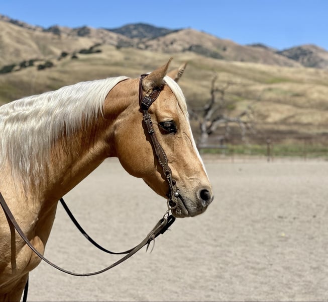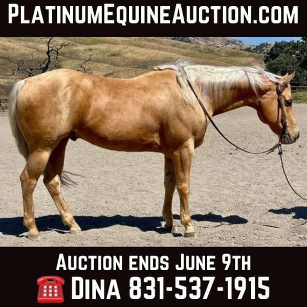 ONLINE AUCTION Place your bids at www.PlatinumEquineAuction.com Starting Bid $3500 Auction ends June 9th, 2024 Need a new saddle? Check out White Rock Saddles on our website or Facebook! Skip N Jump Will 2015 AQHA palomino gelding. Will is stunning with his golden coat and blonde main and tail. He’s is a nice solid built horse standing 15.1. Will is a great ride he will travel slow and low headed and is as comfy as a pair of fluffy slippers. He rides correct with his natural low head set and fluid movement. He has nice correct circles and super controlled transitions in his gaits. Will has been used as a trail horse most of his life so he is one that will take care of his rider. Will has been to several parks and also used out to gather cattle and handled it great. We have worked cattle in the arena and he is very happy playing with them. He will rides alone or with friends and doesn’t mind leading the pack or bringing up the tail end. Will is one of those go with the flow horses that doesn’t get excited about much. We have done some trail obstacles on him and he was so willing and easy he went over bridges, logs, and tires with zero hesitation. Will would also look good doing some pleasure or ranch versatility classes. Will has also been ridden down busy streets and seen all sorts of machinery tractors, quads, and is not bothered by speeding traffic. He has also been exposed to the flag and tarp and would be a beautiful parade horse. Will really wants to please his rider. He is easy to tack up and great for the farrier and vet. I think he would also do well in the English world with his fluid movements and natural headset. This boy is ready to take his next step in life whether that be just a nice solid trail companion or getting into the show ring. The possibilities are endless for his future and I think it’s going to be a bright one. Contact Longhorn Ranch Dina 831-537-1915. Located in Paicines, CA. ONLINE AUCTION Place your bids at www.PlatinumEquineAuction.com Starting Bid $3500 Auction ends June 9th, 2024 Need a new saddle? Check out White Rock Saddles on our website or Facebook!