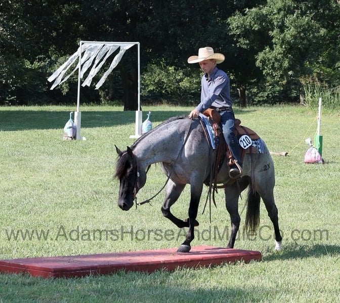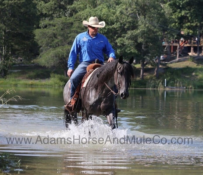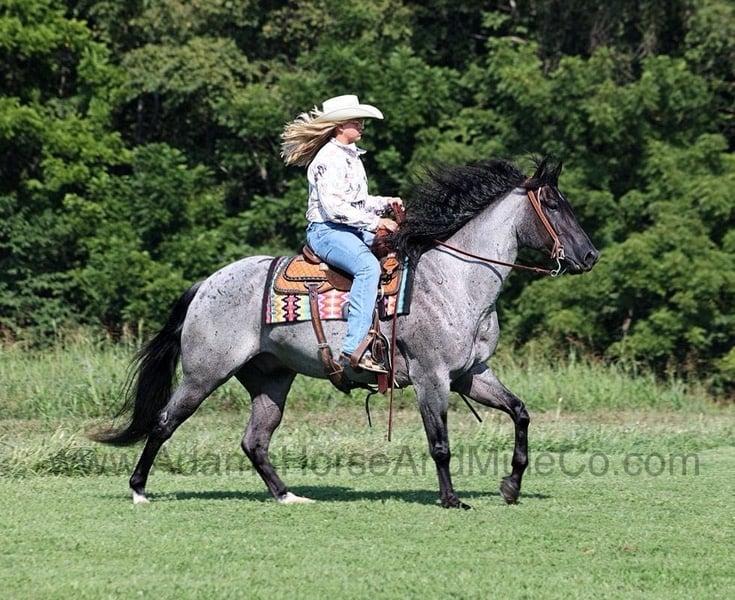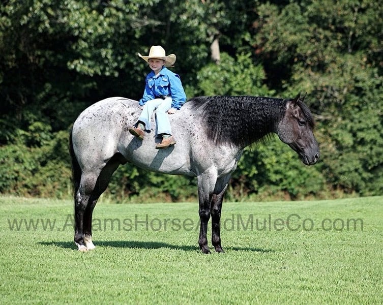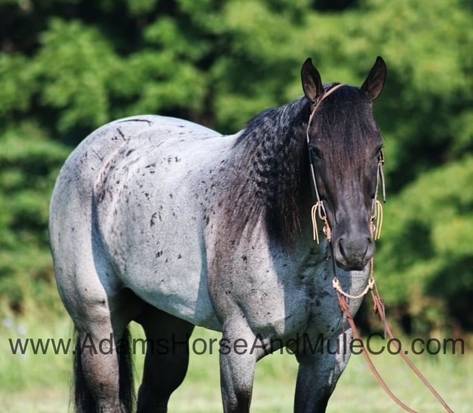Go to www.AdamsHorseAndMuleCo.com for more pics and a video. AHAMC has been in the horse business and sold horses over the internet since 2005. We have a long track record of success with hundreds of happy customers. We work hard to match riders with the correct horses and specialize in beginner safe, family friendly horses that have been used and checked out by our family! Introducing Drifts Money Figure… He gets an “A” in every category but the best part of him is that he is all “B’s”… BIG, BEAUTIFUL, BRAINS and BLUE ROAN!!! Money is a stout built 15.1hh, 9 year old, True Blue Roan, Registered Quarter Horse Gelding! This fall and winter Money has been earning his living working on a feedlot. He has been loading trucks, sorting and doctoring cattle. He has been rode in big country with steep rough elevations. Money is a laid back gentle type of horse that still has all the buttons. Money content to mosey along down the trail and loves going on trail rides. He will cross creeks, ditches, logs and navigate rough rocky areas. He is safe riding in traffic. He has a smooth jog, a nice lope, a good stop, turns a circle both ways, sidepasses and backs with ease! Money has been exposed to all kinds of wildlife such as deer or turkey or other animals like cows or dogs and will go anywhere that he is asked too. He has been rode many miles in the mountains of Eastern Kentucky and encountered every obstacle possible on the trail. He will go up or down even the steepest slopes, across deep creeks, over downed trees, and over all types of rough terrain while still being sure footed. Money is a horse that can do any job that is asked of him, do it with ease and look good while doing it! Take a look at him and we believe that you will give him all A’s as well! Call Eric 606-308-2461 with any questions. Located in Mt. Vernon, KY.