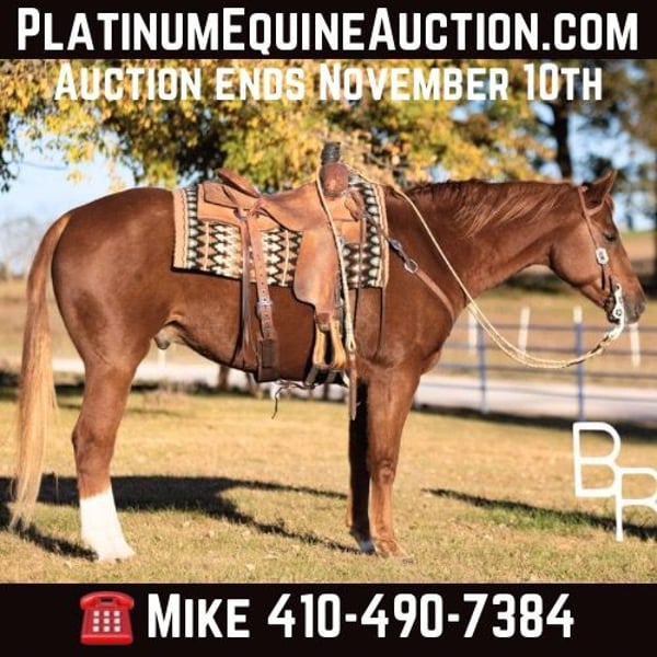 ONLINE AUCTION Place your bids at www.PlatinumEquineAuction.com Starting Bid $3500 Auction ends November 10th, 2024 Need a new saddle? Check out White Rock Saddles on our website or Facebook! Tags A Gunslinger aka Gunner…. This handsome man is Registered in the AQHA. He is 9 years old standing 15.2 hands tall. Gunner is an own son of Ju Juzz Gunslinger out of Smart Kachina Chex by Whix N Tag Chex. Look at his papers he is bred to ride! The best feature of this horse is he is safe and gentle every single day. Gunner has been a trail horse for the most part of his life. As you will see in our video he takes all terrain and obstacles in stride calm and cool. Goes around very soft and collected in the bridle. Would excel in local ranch classes. We have lightly started him over fences. Great barn and trailering manners. He is totally UTD on vet, farrier, and dental. Has all necessary paperwork ready to go. We can help with shipping as well nationwide. Gunner is located in Mountain Grove Missouri. Call Beaver Ranch Mike 410-490-7384 for more information or to set up a time to come ride this awesome horse!! ONLINE AUCTION Place your bids at www.PlatinumEquineAuction.com Starting Bid $3500 Auction ends November 10th, 2024 Need a new saddle? Check out White Rock Saddles on our website or Facebook!