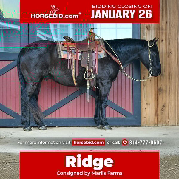 𝐉𝐀𝐍𝐔𝐀𝐑𝐘 ⭐️𝑨𝒍𝒍 𝑺𝒕𝒂𝒓 𝑳𝒊𝒏𝒆𝒖𝒑⭐️ Happening now thru MONDAY | JANUARY 26th - Available EXCLUSIVELY on HorseBid's website! For more details and to register visit: www.Horsebid.com CONSIGNOR CONTACT: Marlis Farms 814-777-0607 LOCATION: Rebersburg, PA BREED: Quarter horse REGISTERED: No REGISTERED NAME: Ridge COLOR: Blue roan HEIGHT: 15.2 AGE: 11 GENDER: Gelding Introducing “Ridge”, a stunning, stout made, 11 year old 15.2 hand blue roan gelding! Not only is he gorgeous, but he is also very versatile with a kind, willing attitude. Ridge is very well broke on the ranch and in the arena - he picks up both leads, neck reins, side passes and has been roped off of! No maintenance or vices, has great ground manners and is good for all the normal barn tasks. Ridge is also seasoned on the trails and rides confidently out alone or with a group. He is surefooted on the trail and crosses anything you point him at! Ridge has ridden into town, is traffic safe and very sensible! He is the good-minded, dependable and flashy type that everyone is looking for! For more information contact Mark @ 814-777-0607 (calls only please).