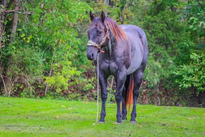 ONLINE AUCTION Place your bids at www.PlatinumEquineAuction.com Starting Bid $3500 Auction ends October 20th, 2024 Need a new saddle? Check out White Rock Saddles on our website or Facebook! This is “BLUE BAMA CANNON”, a registered AQHA TRUE BLUE ROAN GELDING that has done all aspects of ranch work. He has been used in the stockyards and is very cowy, athletic, and fun to ride. He has ponied many other horses. He has been roped off of lots outside in the pasture. He has also been roped off of out of the box. He is also patterned and has been hauled and shown at the junior rodeos. This gelding is a superb trail horse that will go anywhere you want to go. He has a nice turnaround, a solid stop, he will back up, move off of leg cues, and you can open and close gates off of him. He is very personable, friendly, civilized, and gentle. He has no problematic behavior what so ever. He has excellent ground manners, stands tied, loads, bathes, and hauls with no fuss. He is thick made, stands 15.2 hands tall, and is 9 years old. He is a true blue roan with a good foot, solid bone, and a sturdy build. You can take him to get your ranch chores done or enjoy him for leisurely trail rides. He will go anywhere you want to go courageously and bravely. He crosses any depth of water and can handle steep and rocky terrain. He is versatile, well trained, very experienced, and intelligent. He is the package deal with good breeding and an excellent attitude. He lopes nice circles, will one step lope, and he catches his leads. Don’t miss out if you have been wanting a true blue that is a solid and seasoned ranch horse. Call HH Horses Erin 304-238-4155 Located in Flemingsburg, KY. ONLINE AUCTION Place your bids at www.PlatinumEquineAuction.com Starting Bid $3500 Auction ends October 20th, 2024 Need a new saddle? Check out White Rock Saddles on our website or Facebook!