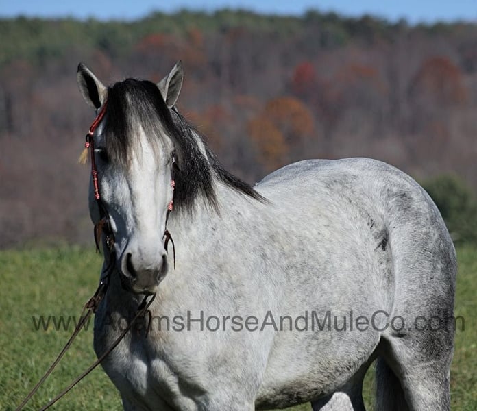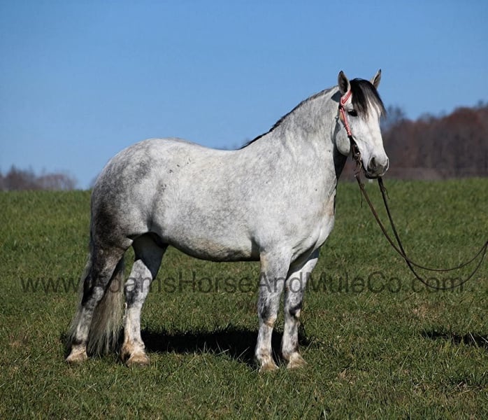 Go to visit our website for more pics and a video. AHAMC has been in the horse business and sold horses over the internet since 2005. We have a long track record of success with hundreds of happy customers. We work hard to match riders with the correct horses and specialize in beginner safe, family friendly horses that have been used and checked out by our family! Tiny is a magnificent looking 16H+, dapple grey Draftcross gelding that is weighing in around 1450lbs and has dapples the size of apples! He is 9 years old and is a sturdy built horse. Tiny is one that does a little bit of everything! He is very well harness broke, pulls all farm implements and carriages as well. He’s been ridden around the ranch, checked cows and rode fences. Tiny is a slow and laid back type of horse that will just ease along down the trails with no hesitation. He is a horse that the whole family will love and one that will help build everyone’s confidence levels! He has been camping in several states and has been ridden by all ages of beginners. When out on the ranch or going down the trails he will cross creeks, ditches, logs and navigate rough rocky areas. He is safe in traffic safe whether that be trucks or cars. He has a nice jog, his lope is smooth as well and he lopes nice circles! He has been exposed to all kinds of wildlife such as deer or turkey. If you are a big ol feller, a lil bitty lady or a combination of each… Tiny will take care of you! Feel free to call Eric 606-308-2461 with any questions!