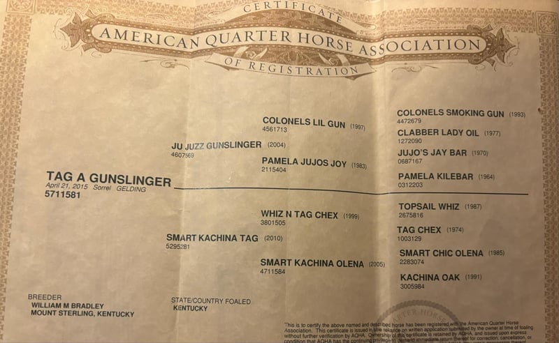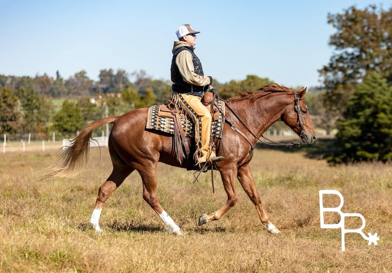 NLINE AUCTION Place your bids at www.PlatinumEquineAuction.com Starting Bid $3500 Auction ends January 5th, 2024 Need a new saddle? Check out White Rock Saddles on our website or Facebook! Tag A Gunslinger aka Gunner He is Registered in the AQHA. Gunner is 9 years old standing 15.2 hands tall. Gunner is an own son of Ju Juzz Gunslinger out of Smart Kachina Chex by Whix N Tag Chex. Look at his papers he is bred to ride! The best feature of this horse is he is safe and gentle every single day. Gunner has been a trail horse for the most part of his life. As you will see in our video he takes all terrain and obstacles in stride calm and cool. Goes around very soft and collected in the bridle. Shown locally this winter. In the ranch horse shows . Gunner has a very easy way with him . Soft transitions and lead changes . He will turn around correct with a good stop. We have lightly started him over fences. Great barn and trailering manners. He is totally UTD on vet, farrier, and dental. Has all necessary paperwork ready to go. We can help with shipping as well nationwide. Gunner is located in Mountain Vernon Missouri. Call Beaver Ranch Mike 410-490-7384 for more information. We encourage customers to come try our horses located in Mountain Grove, MO. ONLINE AUCTION Place your bids at www.PlatinumEquineAuction.com Starting Bid $3500 Auction ends January 5th, 2024 Need a new saddle? Check out White Rock Saddles on our website or Facebook!