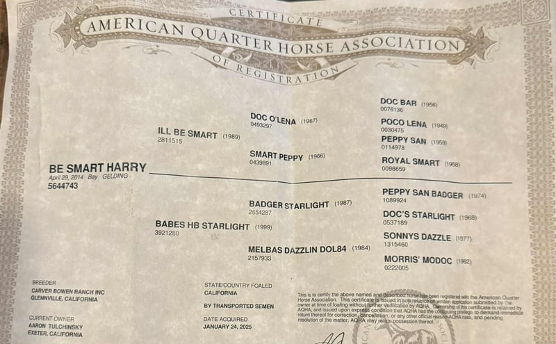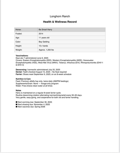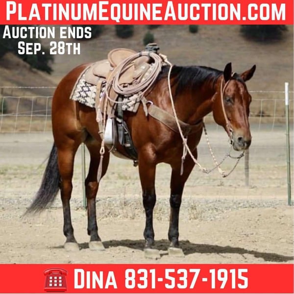 ONLINE AUCTION Place your bids at www.PlatinumEquineAuction.com Starting Bid $3500 Auction ends September 28th, 2025 Need a new saddle? Check out White Rock Saddles on our website or Facebook Be Smart Harry – Legendary Bloodlines, Gentle Ranch Gelding… Be Smart Harry is the kind you don’t come across often — a beautiful bay, big, stout, standing just over 15 hands and weighing 1,250 lbs, with that old-style ranch horse look. He’s bred in the purple, by I’ll Be Smart (Doc O’Lena × Smart Peppy, dam of Smart Little Lena) and out of a Badger Starlight daughter, with Sonny’s Dazzle and Morris’ Modoc also stamped into his pedigree. His papers speak volumes, and his size, bone, and mind live up to them. We couldn’t be more proud to offer Harry here at Longhorn Ranch. He represents everything we stand for — safe, seasoned, gentle, and as solid as they come. Whether you want to go sorting, roping, or just enjoy the brokest trail horse you could ever imagine — Harry is the one. 🔹 The Ultimate Seasoned Ranch Horse Harry’s resume is second to none. He will stand and hold one to doctor, drag calves to the fire, brand, sort pairs, and work a gate without letting one by. He’s cowy, steady, and always on the job. This is the kind of cow sense that can’t be taught — it’s bred into him and polished with experience. 🔹 The Perfect Trail Partner Out on the trail, Harry is every rider’s dream. He walks low-headed and relaxed anywhere you point him — through water, brush, rocky terrain, or down the road. Obstacles, flags, tarps, pool noodles, traffic, and cattle trucks don’t rattle him. Whether alone or in a group, he’s safe, confident, and always a pleasure to ride. 🔹 Gentle for Any Level Rider Harry is the kind of gelding everyone wants in their barn. His steady, forgiving nature makes him safe for riders of all levels — from beginners finding their balance to seasoned hands who appreciate a truly broke bridle horse. He adjusts to his rider, always patient and eager to please, and gives you a dependable ride every single time. 🔹 Solid, Beginner-Friendly Rope Horse Harry has the size, bone, and calm nature to make him a dependable head horse. He breaks flat, runs strong to the hip, and handles cattle with the same steady mind he shows everywhere else. He’s quiet in the box, forgiving of a novice roper, and broke enough to let an experienced hand go win. That rare combination makes him beginner-friendly yet solid enough to rope on all day. 🔹 Saintly Ground Manners Harry is as kind on the ground as he is under saddle. He’s good in a herd or solo in a stall, always easy to handle, clip, bathe, shoe, and haul. Friendly, personable, and eager to please, he’s the horse that greets you with a nicker and genuinely enjoys people. 🔹 The True Bridle Horse Harry isn’t just broke — he’s a finished bridle horse. Soft in the face, correct in every maneuver, and stylish in his way of going. He spins, slides, side-passes, neck reins, and carries himself collected and correct. He’s as enjoyable to ride in the arena as he is outside. Be Smart Harry is truly one in a million — a big, stout, seasoned gelding with legendary bloodlines, ranch seasoning, reined cow horse, rope-horse ability, trail confidence, and bridle-horse polish. Gentle, beginner-friendly, and always eager to please, he’s the kind of horse you can be proud to own and enjoy every single day. We are located in Paicines, CA. Call Dina with Longhorn Ranch 831-537-1915 with any questions ONLINE AUCTION Place your bids at www.PlatinumEquineAuction.com Starting Bid $3500 Auction ends September 28th, 2025 Need a new saddle? Check out White Rock Saddles on our website or Facebook