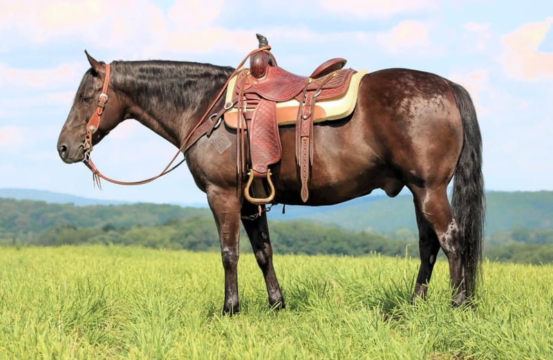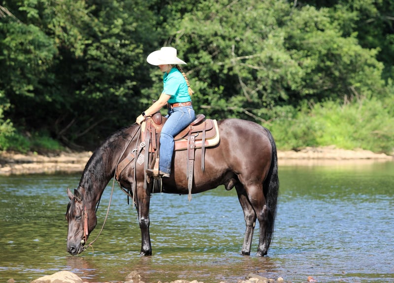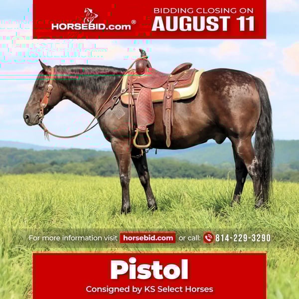 ⚜ The HERITAGE Classic ⚜ Happening now thru MONDAY | AUGUST 11th - Available EXCLUSIVELY on HorseBid's website! For more details and to register visit: www.Horsebid.com CONSIGNOR CONTACT: KS Select Horses 814-229-3290 LOCATION: Clarion, PA BREED: QH REGISTERED: No REGISTERED NAME: Pistol COLOR: Black HEIGHT: 15 AGE: 12 GENDER: Gelding Pistol is a 12 Year Old Black Quarter Horse Gelding. He is 15 hands tall and very stocky built. He is built like the old foundation Quarter Horses. Wow Check Him Out!! He is the whole package! Good Looking, Perfect Age, Quiet , Gentle , Super Broke To Ride and Safe!! Pistol is a very good trail horse. He will go anywhere you ask him to go on the trail. Goes thru mud, water and over logs with ease. Trail ride him out alone or with other horses. If you been looking for that reliable seasoned trail mount then Pistol is exactly that. He also rides nicely in the arena and has a nice walk, trot and canter. Lopes good circles and hits his leads each way. Would be a good horse to give kids riding lessons on or beginners or timid riders. We have also have used him to push cattle around the farm and he really enjoys any kind of ranch work you give him to do also. Pistol stands for the mounting block making him easy to get on. He is very friendly and loves attention. He is good for the farrier and the vet and easy to bath. If you been looking for that super nice all around gelding then be sure to check Pistol out. We can help arrange delivery anywhere in the United States. Call or Text Kris at 814-229-3290. Thank You and God Bless