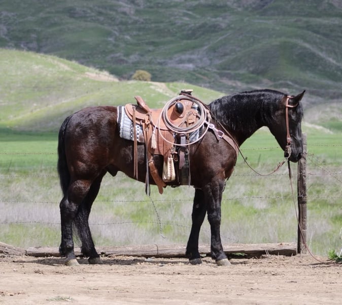ONLINE AUCTION Place your bids at www.PlatinumEquineAuction.com Starting Bid $3500 Auction ends April 20th, 2025 Need a new saddle? Check out White Rock Saddles on our website or Facebook! Blackjack – The Ultimate Gentlemen, you don’t see many like him. He’s an 11-year-old Friesian quarter cross standing at a solid 15 hands. This guy is the perfect mix of finesse and gentleness, and let me tell you, he’s the most laid-back dude you could ever meet. You can throw anything at him, and he won’t even blink! He’s an absolute dream to ride, super easygoing, and perfect for anyone, whether you’re a newbie or a seasoned rider. He carries himself beautifully and moves like a pro. He picks up all his leads effortlessly and has a smooth-as-glass ride. Plus, he’s got a nice stop and backs up like a champ. Riding him is just a pleasure! He rides collected and has the perfect one hand neck rein. Blackjack’s done everything from cattle work to trail obstacles. He’s seen it all: bridges, flags, tires, tarps – you name it! On the trail, he’s got this calm easy going vibe that makes him shine. No surprises for this guy; he’s tackled all kinds of terrain, wildlife, downed trees, and thick brush like a pro. If you’re looking for a horse that anyone can ride, Blackjack is your guy. You can ride him bareback in halter and crawl all over him he’s a saint. He’s even been down busy streets with cars zooming by, and he just strolls along like it’s no big deal. He ties, clips, and bathes like a champ, and he just loves hanging out with his humans. He loads and hauls well, is great for the farrier, and comes right to you when you call. Honestly, if you’re in the market for a safe, trustworthy, and all-around gentleman of a horse, you’ve got to check out Blackjack. If you want more info, contact Dina at Longhorn Ranch at 831-537-1915. We are located in Paicines, CA. ONLINE AUCTION Place your bids at www.PlatinumEquineAuction.com Starting Bid $3500 Auction ends April 20th, 2025 Need a new saddle? Check out White Rock Saddles on our website or Facebook!