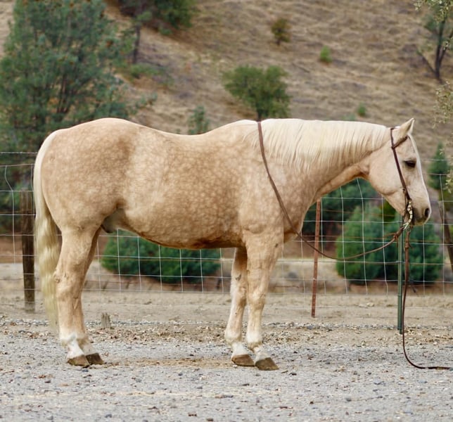 ONLINE AUCTION Place your bids at www.PlatinumEquineAuction.com Starting Bid $3500 Auction ends November 30th, 2025 Need a new saddle? Check out White Rock Saddles on our website or Facebook The Golden Kind Everyone Looks For but Rarely Finds. If you’ve been waiting for a horse that combines eye-catching beauty with real-world experience take a close look at Cash. This stunning 12-year-old, 15-hand, 1,200-pound dapple palomino gelding is the complete package: gentle, seasoned, broke, and dependable in every situation. Cash is as safe and user-friendly as they come. He’s been used extensively on the ranch for gathering, sorting, doctoring, and branding, and he handles every job with maturity and confidence. Out on the trail, he is rock solid — surefooted through steep country, steady in the trees, calm in deep water, and comfortable in rough terrain. He crosses bridges, walkovers, tires, and any obstacle you present with zero hesitation. Tarps, flags, traffic, dogs, bicycles, and busy environments don’t faze him in the slightest. In the arena, Cash shows off the kind of training that takes years to build. He lopes around smooth and collected, stays soft in the bridle, has a clean stop, easy turnaround, and a correct, uncomplicated way of going that riders of any level can appreciate. He’s the same horse every day — whether he’s been ridden all week or pulled straight from turnout. Ropers, pay attention. Cash is a finished heel horse with all the credentials. He scores quiet, leaves flat, hunts the corner, and drags his hip with confidence every run. He’s extremely easy to rope on, stays cool and correct, and has been hauled to jackpots and used in real-world ranch roping. You can head on him as well — he’s versatile, experienced, and steady in the box. Cash has the kind of foundation and seasoning that makes him suitable for riders of all levels. He’s gentle enough to teach someone new, and broke and dependable enough for a serious hand who wants a horse they can trust to get every job done right. He ties, clips, bathes, loads, hauls, stalls, or pastures with no issues and has been an absolute gentleman in every setting. Cash represents the kind of quality most people hope to find but rarely get the chance to buy. He brings looks, training, and real-world dependability together in one golden package. If you want a horse you can be proud to own from the moment you unload him, Cash is the one that stands out. Dina – Longhorn Ranch • Paicines, California (831) 537-1915 Nationwide shipping available. ONLINE AUCTION Place your bids at www.PlatinumEquineAuction.com Starting Bid $3500 Auction ends November 30th, 2025 Need a new saddle? Check out White Rock Saddles on our website or Facebook