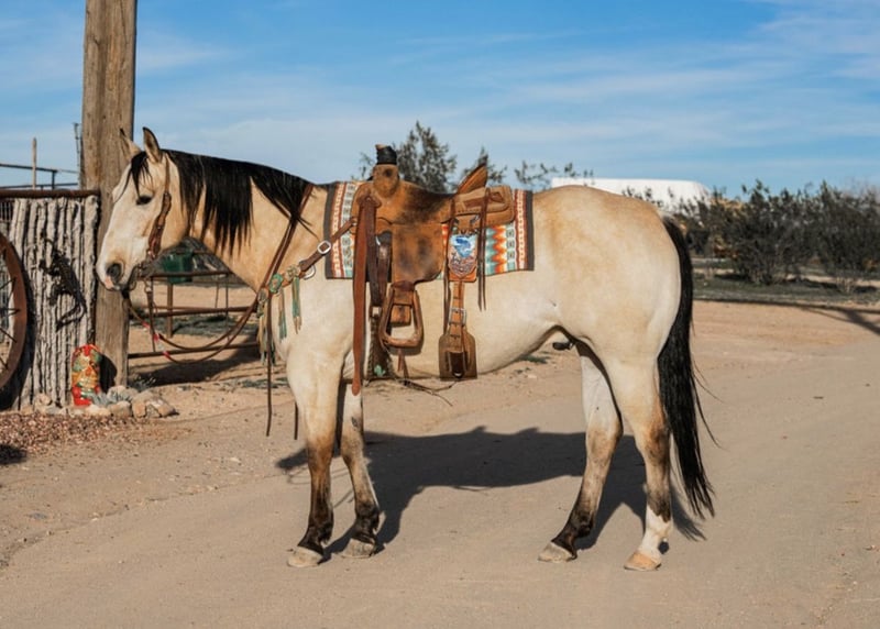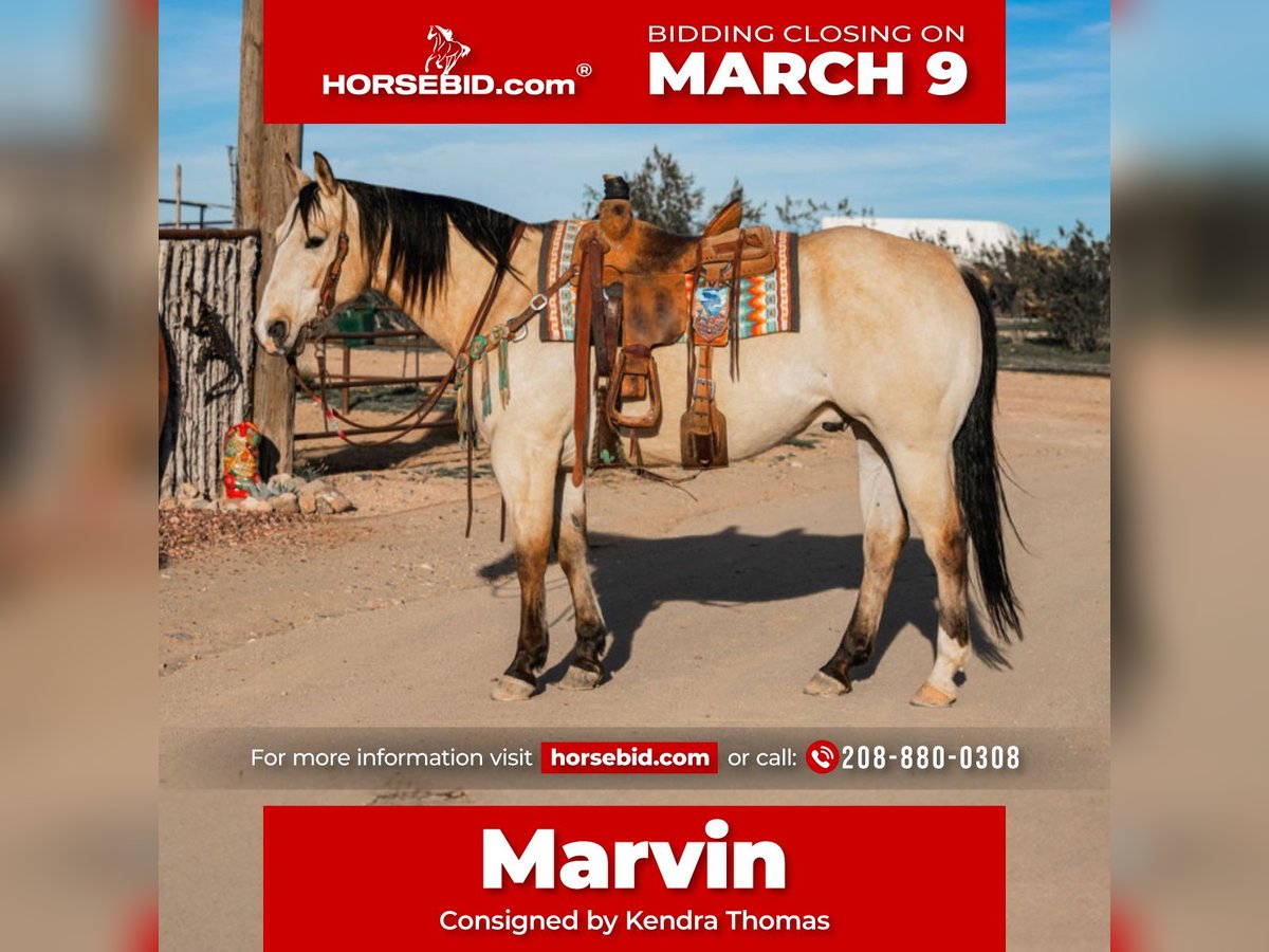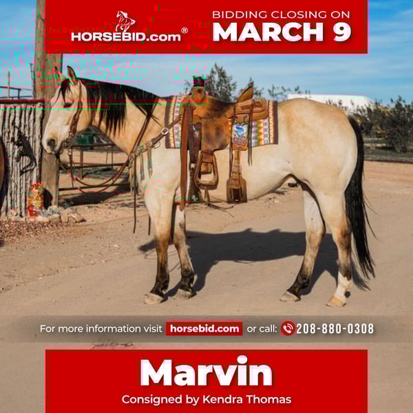 ℳ𝒶𝓇𝒸𝒽 ♦️𝐑𝐈𝐃𝐄𝐑'𝐒 𝐂𝐇𝐎𝐈𝐂𝐄♦️ Happening now thru MONDAY | MARCH 9th - Available EXCLUSIVELY on HorseBid's website! For more details and to register visit: www.Horsebid.com CONSIGNOR CONTACT: Kendra Thomas 208-880-0308 LOCATION: Wickenburg, AZ BREED: QH REGISTERED: Yes REGISTERED NAME: Mr Genuine Valentine COLOR: Buckskin HEIGHT: 15.1 AGE: 12 GENDER: Gelding Marvin is the real deal & look good doing it he’s drop dead gorgeous!!! We’ve had everyone from a #4 to #7 header rope on him, he’s got a really nice move but won’t go left for a more novice roper until you ask him to, you can run lots of steers on him. He’s very broke and light mouthed, he’s got a nice stop, he’s lightly started heeling also. In the sorting & penning he will watch a cow and loves doing it. Marvin hauls great, gets along with other horses, baths, is good to shoe, he’s a pleasure to have around. You can let him sit for a few weeks and there’s no funny business just take him right to the roping pen & he’ll do his job.