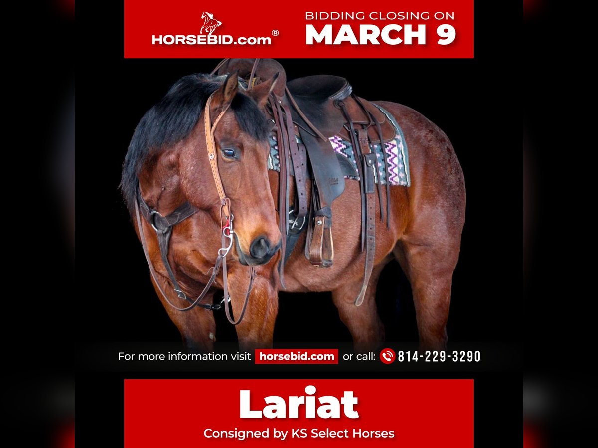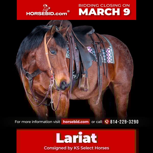 ℳ𝒶𝓇𝒸𝒽 ♦️𝐑𝐈𝐃𝐄𝐑'𝐒 𝐂𝐇𝐎𝐈𝐂𝐄♦️ Happening now thru MONDAY | MARCH 9th - Available EXCLUSIVELY on HorseBid's website! For more details and to register visit: www.Horsebid.com CONSIGNOR CONTACT: KS Select Horses 814-229-3290 LOCATION: Clarion, PA BREED: QH REGISTERED: Yes REGISTERED NAME: Lariat COLOR: Bay Roan HEIGHT: 15.1 AGE: 12 GENDER: Gelding Lariat is a Registered Bay Roan Quarter Horse Gelding. Standing 15.1 hands tall and very stocky built. Built to carry any size rider and stands at the mounting block making him easy to get on and off. Lariat is very seasoned making him safe, reliable and dependable when riding him whether its on the ranch or a Sunday afternoon trail ride. He is a great trail horse that has been trail ridden many of miles and is very sure footed in the rough terrain and nothing bothers or phases him on the trail. He will trail ride all day on a nice loose rein . He has a great neck rein making him very easy to steer, even for the beginners. He also rides nicely in the arena and has a nice walk, trot and canter. Has a nice head set . His lope is also nice and smooth. Lariat has also worked on a ranch and feed lot and can perform any job on the ranch with ease. He is friendly and loves attention. Good for the farrier and vet. My kids 10 years old and 8 years old can catch him up and ride him all on there own. Lariat is the kind of horse most people need and our looking for so don't miss out on this opportunity to own such a nice all around horse. Call or Text Kris at 814-229-3290. We can help arrange delivery anywhere in the United States. Thank You and God Bless.