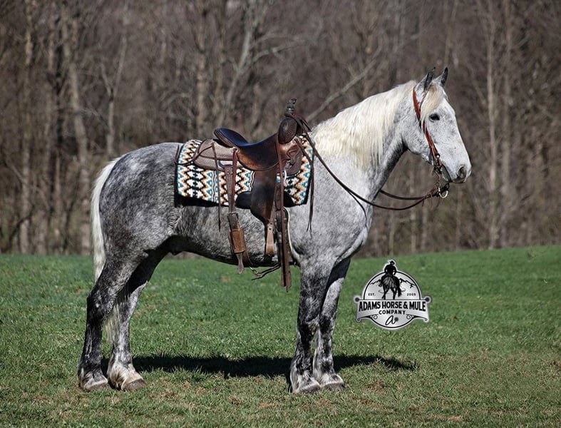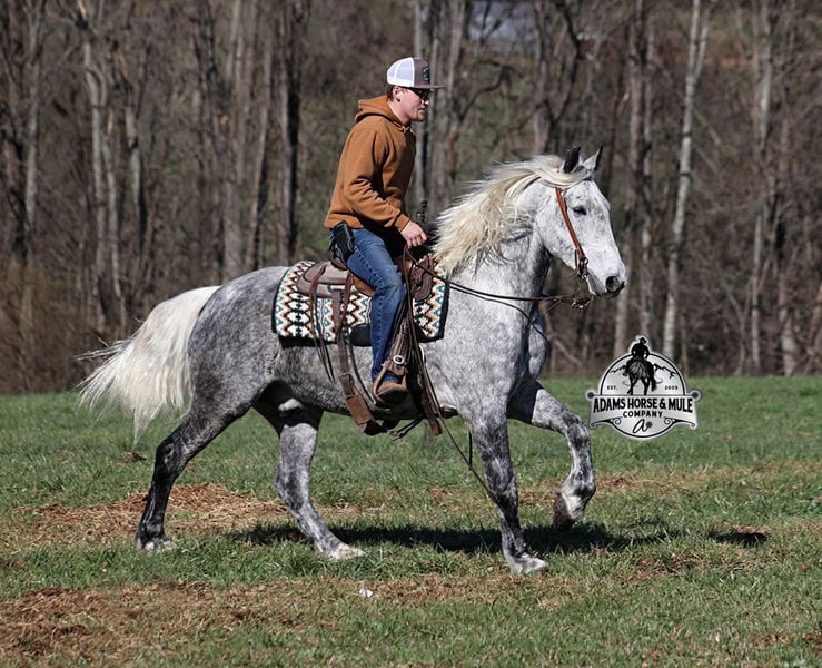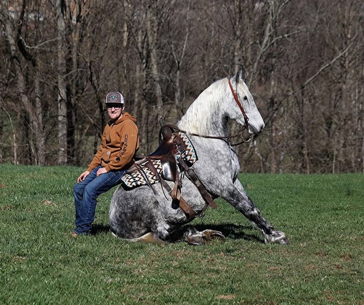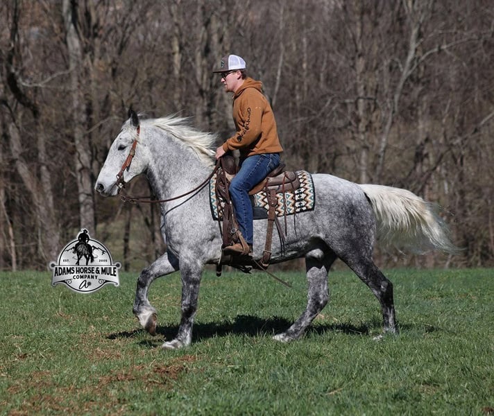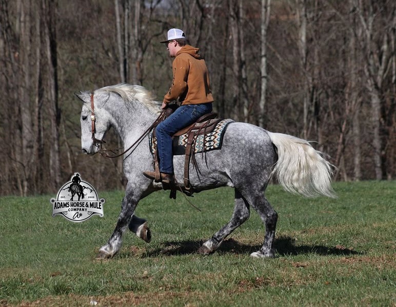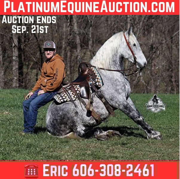 ONLINE AUCTION Place your bids at www.PlatinumEquineAuction.com Starting Bid $3500 Auction ends September 21st, 2025 Need a new saddle? Check out White Rock Saddles on our website or Facebook All Smoked Out has Dapples the size of apples! Just try to count the dapples on this guy! Smokey is a stout built draftcross gelding standing around 15.2hh, he will weigh 1250lbs, he is 9 years old, and he is that super pretty dapple grey coloring with a silver mane and tail! He is one cool looking guy! Not only does he look cool, he is has all of the other boxes checked as well… he is Mr. Personality, as friendly as they come, loves attention and is very calm natured. Smokey is out of the same breeding program as several other top draftcross geldings that we have had over the last 4 years and every one of them has the right mind with the calm nature that makes them great family horses. Smokey has been in our program since last year and has completed the natural horsemanship training and does liberty work and he also knows some tricks, he will bow, lay down and set on his rump. Smokey has been ridden by every member of our family all the way down to our 5 year old. Smokey is great on trails and he will cross creeks, ditches, logs and navigate rough rocky areas. He has a smooth jog, a VERY VERY nice easy to set lope, a good stop, turns a circle both ways and backs with ease! He has been exposed to all kinds of wildlife such as deer or turkey or other animals like cows or dogs and will go anywhere that he is asked too. He has been rode many miles in the mountains of Eastern Kentucky and encountered every obstacle possible on the trail. He will go up or down even the steepest slopes, across deep creeks, over downed trees, and over all types of rough terrain while still being sure footed. Smokey is not cinchy, cold backed, does not crib or weave. In addition to riding, Smokey has also been driven down the highways as well. Smokey is a super cool horse that anyone is sure to love!!! Feel free to call Eric 606-308-2461 with any questions. ONLINE AUCTION Place your bids at www.PlatinumEquineAuction.com Starting Bid $3500 Auction ends September 21st, 2025 Need a new saddle? Check out White Rock Saddles on our website or Facebook