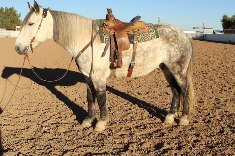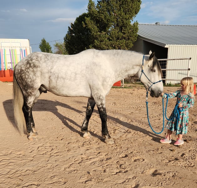 ONLINE AUCTION Place your bids at www.PlatinumEquineAuction.com Starting Bid $3500 Auction ends November 30th, 2025 Need a new saddle? Check out White Rock Saddles on our website or Facebook A real life unicorn! Willie is the total package big, tall, stout and will turn heads wherever you go. The horse that dreams are made of perfect for the whole family. Willie is a 11 year old 16.2 hand 1500lb beautiful grey draft cross gelding. Willie is the first one to greet you in the barn or in pasture and has a larger than life personality. Willie is ready to go in any direction ride him english or western or hop on bareback and go or teach him to pull a cart. He has ridden inside and out well mannered tied at the trailer. Rides trails with easy will cross bridges or skip the bridge and go straight through the water. Has spent time in and out of the arena around cows, construction, Rocky trails, mountain country, dry desert, who needs a car Willie will get you through town just fine. Truly a gentle giant extremely gentle and respectful with children, loves attention, calm, quiet, stands tied, not spooky, no funny business. Good strong feet kept on a consistent schedule . Willie is well broke rides well off neck reining and leg pressure smooth gates good stop and back. The sky is the limit for this horse he is ready to tackle any job you throw at him. Don’t miss your opportunity to own a unicorn. Please contact for any further questions. Located in Roswell, NM. For more info contact Ben Thomas 575-910-0168. ONLINE AUCTION Place your bids at www.PlatinumEquineAuction.com Starting Bid $3500 Auction ends November 30th, 2025 Need a new saddle? Check out White Rock Saddles on our website or Facebook