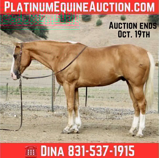 ONLINE AUCTION Place your bids at www.PlatinumEquineAuction.com Starting Bid $3500 Auction ends October 19th, 2025 Need a new saddle? Check out White Rock Saddles on our website or Facebook Augustus aka Gus is a 14.3 hand, 12 year old, palomino gelding that’s broke, dependable, and practical. He’s the kind you can saddle up and get right to work on without a fuss. Simple to ride, correct in his way of going, and steady-minded, he fits both ranch and trail life with ease. On the trail he carries a good forward walk, covers country without dragging, and goes wherever you point him. He’ll cross water, logs, bridges, and brush without hesitation, and he doesn’t blink at flags, tarps, dogs, wildlife, or highway traffic. Whether you’re riding through the hills, heading down the road, or working through a set of obstacles, Gus stays straight, quiet, and reliable. He’s easy to haul and settles well in new places. Pasture or stall makes no difference to him — he’s content either way. He tacks up without a fight, stands tied all day, and is good for the farrier and vet. In the arena he’s collected, soft in the bridle, and responsive to leg cues. He’s not fancy or complicated, but he gives you a ride that’s correct and comfortable every time. Augustus is the kind of gelding that makes life simple. Good-minded, useful, and good-looking, he’s the sort that always earns his keep. Located in Paicines, California. Call or text Dina with Longhorn Ranch 831-537-1915 ONLINE AUCTION Place your bids at www.PlatinumEquineAuction.com Starting Bid $3500 Auction ends October 19th, 2025 Need a new saddle? Check out White Rock Saddles on our website or Facebook