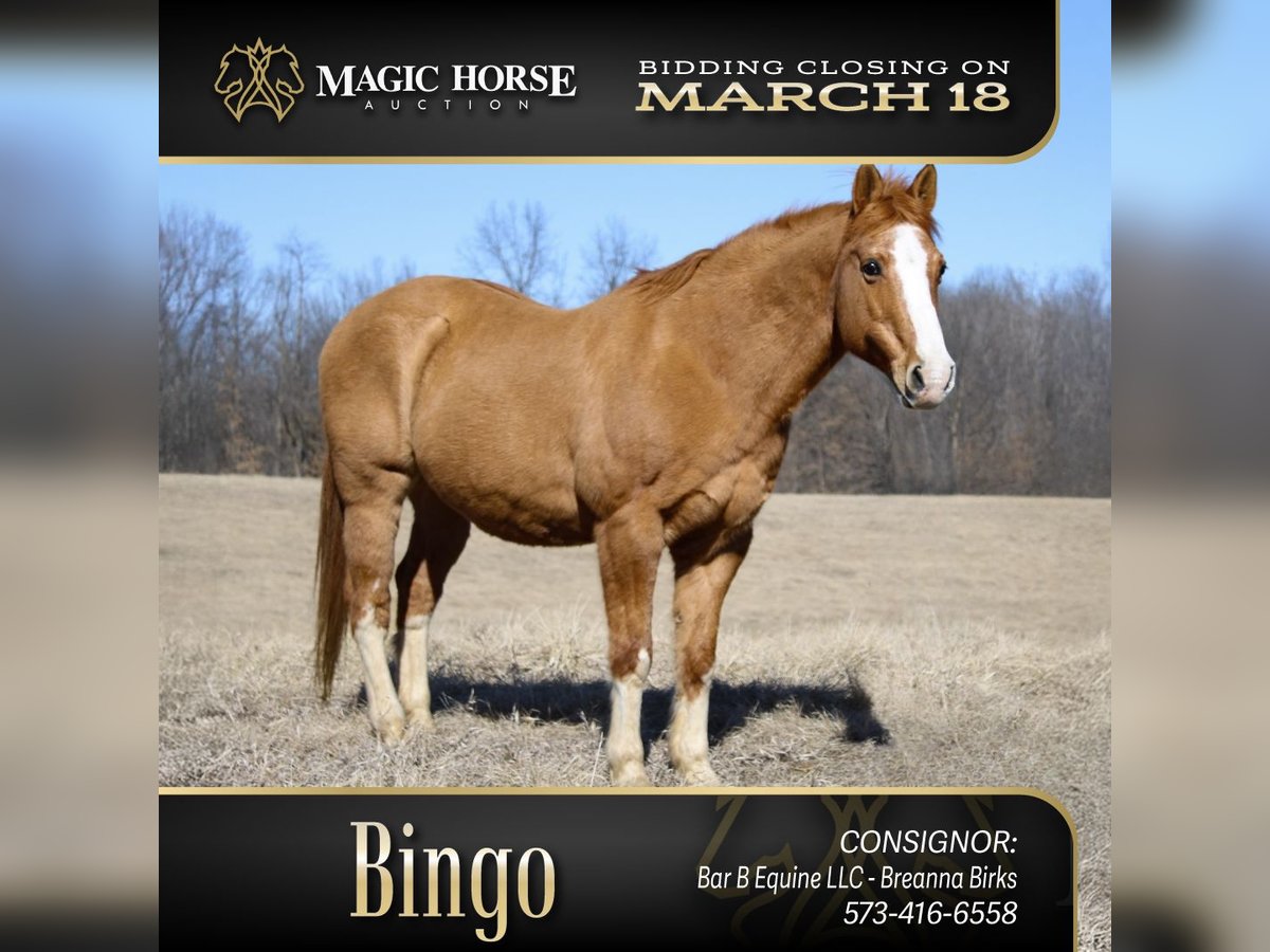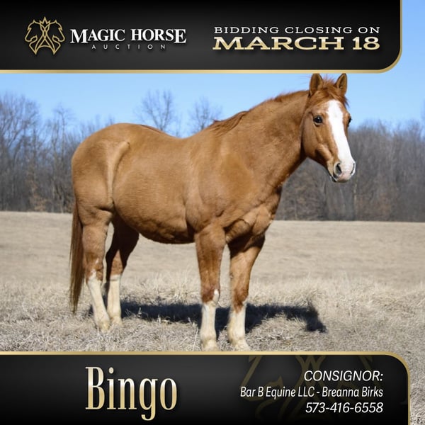 "AVAILABLE ON ONLINE HORSE AUCTION AT www DOT MagicHorseAuction DOT com BIDDING OPEN NOW thru TUESDAY | MARCH 18th - BUY IT NOW AVAILABLE! *Final price will be determined on auction site* CONSIGNOR CONTACT INFO: Breanna Birks - 573-426-6558 LOCATION: Atlanta, MO Bingo is a 12 year old 14.2 hand gelding who is just that absolute unicorn of a horse! If you are looking for a horse that will build your confidence, take care of the family, or just looking for a well and relaxed horse where you can drop your reins and crack open a cold beer or capri sun- Bingo is the perfect candidate! Bingo is flashy, kind, honest, and gentle. This guy is so broke you can ride him forward, backwards, standing up, or upside down and he will plod right down the trail! Bingo has the handiest neck rein known to horse, and will cross water, bridges, longs, roads and any kind of obstacle placed before him. He is traffic safe- this includes cars, four wheelers, tractors, large trucks, and even buggies! Bingo is easy to catch and handle, standing perfectly for grooming, saddling, and mounting. He takes a bridal with ease, and never throws no fuss at any riders. We have serviced a few lessons on him and he does incredible! He is entirely user friendly, will move off leg or neck and will even plow rein for more hands on riders. Bingo does great in a mixed herd, being pastured with mares and gelding, as well as equine of any size including minis! He will load and unload into any trailer, and stand tied quietly. He holds up for long hauls and even longer trail rides! Bingo has been taken to eminence and does lovely! Bingo’s only con that we’ve found is that he can be a touch bit sensitive when barefoot and on freshly laid gravel. He does great with a set of shoes but doesn’t necessarily need them! Please note that all videos he is barefoot. Bingo will pony other horses or be the one being ponied, will follow or lead a trail group, and is guaranteed to hold up to all your horsey expectations! If bingo seems like a good candidate for your family, lesson program, kids camp, or anything else you have in mind- please don’t be afraid to shoot me a message or call! Happy bidding ya’ll !!!"