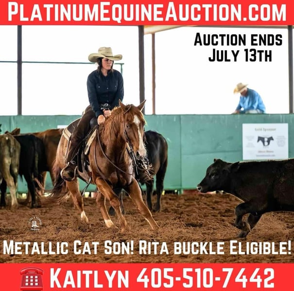 ONLINE AUCTION Place your bids at www.PlatinumEquineAuction.com Starting Bid $3500 Auction ends July 13th 2025 Need a new saddle? Check out White Rock Saddles on our website or Facebook! A Metallic Cat CD – aka “Hammy” is The Total Package: Pedigree • Performance • Personality… he has it all! Fondly known around the barn as Hammy, this gelding is a true favorite — and for good reason. With his goofy personality, willing attitude, and exceptional talent, Hammy shines no matter what you ask of him. Hammy is a 14.2h, 2013 model own son of the legendary Metallic Cat, whose lifetime earnings exceed $673,000 and progeny earnings are over $5 million. Metallic Cat is the leading sire in both NRCHA and NCHA. His dam, CDs Star Lady, earned over $6,800 and has produced more than $40,000. She is an own daughter of the great CD Olena, giving Hammy a pedigree packed with proven performers — and he lives up to it. Hammy has $4700 total ($1200 NCHA) earnings and AQHA points. While he wasn’t campaigned heavily in the NCHA, he has been shown locally and added to his lifetime earnings along the way. More than that, he has been an incredible teacher. This is the horse that taught me how to ride one that truly looks at a cow. He’s smooth, responsive, and lets you enjoy every moment in the saddle. In the show pen, Hammy stands out in ranch riding. He crosses obstacles with confidence, side passes over logs with ease, and has a stylish, powerful stop that always turns heads. He’s quiet and confident wherever you take him and never gets flustered — even in the busiest warm-up pens. He’s easy to prep, easy to ride, and just plain fun. Out on the trails, Hammy is the same steady partner. He’s calm, confident, and always up for an adventure. He handles water crossings, brush, and uneven terrain with ease. He’s safe around wildlife, heavy equipment, dogs, and passing vehicles. This is a horse you can take anywhere and trust to take care of you. Hammy is dual-registration eligible with APHA, expanding his versatility and value even further. He is also Riata Buckle eligible, opening doors to an exciting and lucrative incentive program for ropers and performance competitors. He is fit, in shape, and ready to step into the show pen today. Whether you’re looking for a horse to win on, learn from, or simply enjoy, Hammy checks every box. He’s safe for absolutely anyone, in and out of the show pen. Horses like this don’t come along every day — don’t miss the chance to make him part of your story. Hammy will also come with his custom halter — a small touch for a horse that’s anything but ordinary. Message for more information or to schedule a time to come meet Hammy. Contact Kaitlyn with Lazy H Equine 405-510-7442 with any questions. We are located in Elk City, OK. Vet check is on file. ONLINE AUCTION Place your bids at www.PlatinumEquineAuction.com Starting Bid $3500 Auction ends July 13th 2025 Need a new saddle? Check out White Rock Saddles on our website or Facebook!