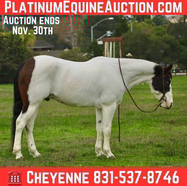 ONLINE AUCTION Place your bids at www.PlatinumEquineAuction.com Starting Bid $3500 Auction ends November 30th, 2025 Need a new saddle? Check out White Rock Saddles on our website or Facebook Blueboy is a handsome 12-year-old, 14.2hh paint gelding with two striking blue eyes and an easygoing, willing personality. He is a joy to be around and very simple to handle, making him a pleasant and reliable partner for a variety of riders. Blueboy has extensive experience on trails, roads, and in the arena. He excels on the trail and genuinely enjoys going on adventures. He travels confidently through steep, narrow terrain and moves with surefooted ease. He will lead the group without hesitation, ride calmly and consistently in the back, or go out alone with no issues. He is not buddy or barn sour and remains steady regardless of the situation. He also loves the water and will cross anything placed in front of him. Under saddle, Blueboy has a natural low headset and is very easy to direct. He neck reins, responds well to leg cues, has a dependable stop, and catches both leads easily in the arena. He is soft, responsive, and comfortable to ride. Blueboy is also good with time off and does not get fresh when brought back into work. He loads and hauls well and gets along nicely with other horses. With his temperament, trail experience, and solid training, Blueboy would make an excellent horse for trail competitions or for anyone looking for a trustworthy, enjoyable partner both in and out of the arena. He is located in Bitterwater, CA. for more info contact Cheyenne at 831-537-8746. ONLINE AUCTION Place your bids at www.PlatinumEquineAuction.com Starting Bid $3500 Auction ends November 30th, 2025 Need a new saddle? Check out White Rock Saddles on our website or Facebook
