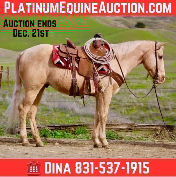ONLINE AUCTION Place your bids at www.PlatinumEquineAuction.com Starting Bid $3500 Auction ends December 21st, 2025 Need a new saddle? Check out White Rock Saddles on our website or Facebook Draco – Safe, Gentle, and Just the Right Amount of Adorable If you’ve been searching for a horse that’s broke, gentle, and basically a four-legged security blanket, meet Draco. This snowflake palomino Appaloosa gelding is 12 years old, 14.3 hands, and comes standard with peace of mind. He’s the kind that takes care of his rider like he’s getting paid for it. Draco neck reins, moves off your leg, and is just easy. He lopes easy circles, has clean transitions in every gait, a soft stop, and a ranch-style turnaround that’s just simple. Out on the trail, he’s calm, confident, and surefooted. Rocks, brush, water, wildlife, tight turns, steep country — Draco handles it all like he’s guiding a tour group. Narrow paths? Cool. Downhill slopes? He takes them like he’s carrying fine china. He’s been to parades and rodeos and has seen more commotion than a county fair on free-admission day. Flags, tarps, tires, bridges, dogs, strollers, traffic, ranch equipment — Draco looks at it all like, “Buddy, I’ve seen worse.” He’s gathered cattle and done ranch work, but this horse isn’t all business. He’s got that fun, go-anywhere, try-anything attitude that makes every ride feel easy. Want to go check fences? Sure. Want to just mosey down the road and enjoy the view? Draco thinks that’s a perfectly respectable life choice. He clips, ties, bathes, hauls, and stands for the farrier like a gentleman. He is currently barefoot . Up to date on vaccinations and farrier care — no “projects” here, just a horse that’s been loved, and ready to join your family for the holidays. If you want safe… if you want sane… if you want a horse you can actually hand to a friend without giving them a training manual, Draco is your guy. 📍 Dina • Longhorn Ranch – Paicines, California 📞 (831) 537-1915 🚚 Nationwide wide ONLINE AUCTION Place your bids at www.PlatinumEquineAuction.com Starting Bid $3500 Auction ends December 21st, 2025 Need a new saddle? Check out White Rock Saddles on our website or Facebook