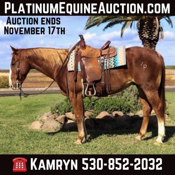 ONLINE AUCTION Place your bids at www.PlatinumEquineAuction.com Starting Bid $3500 Auction ends November 17th, 2024 Need a new saddle? Check out White Rock Saddles on our website or Facebook! If you’re searching for a reliable, hardworking ranch horse, Boon is the one for you. This eye-catching roan gelding with a striking flaxen mane and tail is as versatile and dependable as they come. Boon has been thoroughly trained and has proven himself in every task a ranch horse could face – branding, gathering, sorting, checking fences – you name it, Boon has done it. Boon is a 11 year old, 15H, Sorrel Roan Registered Quarter horse, gelding. He is a powerful and experienced in the roping arena, having roped everything from calves to bulls. He’s the kind of horse that knows his job inside and out and doesn’t hesitate to dig in and work hard. He’s a frequent hand in the branding pen, always focused and ready for whatever is asked of him. In the arena, Boon is as smooth and fancy as they come, with soft, easy gaits, a big stop, and impressive turnarounds. A natural with cattle, Boon is a cutting machine and would excel in ranch sorting or ranch cutter classes. His quick, precise moves make him an ideal choice for any cow-working competition. He’s versatile enough to transition into the show pen as a ranch riding horse or a sorting horse; with his talents, he can do it all effortlessly. Boon has been extensively ridden over all types of terrain, handling everything from muddy conditions to city streets without a second thought. He’s traffic-safe, surefooted, and ready for any environment. Boon has spent most of his life working and thrives with regular work he’s ready for his new home take him out lunge him around a go have fun on any adventure. Boon is a great horse to have on the ranch, always willing and ready for any job. If you’re looking for a well-rounded, skilled ranch partner, Boon is ready to be your go-to horse. Please contact Kamryn at KW Ranch 530-852-2032 Located in Pleasant Grove, CA. ONLINE AUCTION Place your bids at www.PlatinumEquineAuction.com Starting Bid $3500 Auction ends November 17th, 2024 Need a new saddle? Check out White Rock Saddles on our website or Facebook!