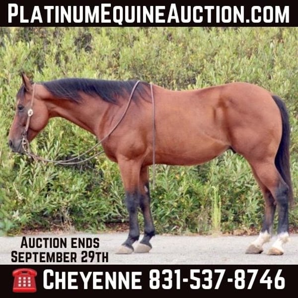 ONLINE AUCTION Place your bids at www.PlatinumEquineAuction.com Starting Bid $3500 Auction ends September 29th, 2024 Need a new saddle? Check out White Rock Saddles on our website or Facebook! Dan is an 11yr old bay gelding. Standing firmly at 15HH and thick as a brick, with sturdy bone and all the shape you could ask for! Dan is the epitome of kindness, patience, and a gentle nature. He is grandma safe, and toddler approved! His calm and collected demeanor is constant, even in challenging, intense situations. He is suitable for all level riders, from true beginners to advanced. Dan’s relaxed approach to trails ensures a safe and enjoyable experience. He has been hauled all over, from high mountain trails to noisy, packed beaches. He goes anywhere you point him without hesitation. He will walk, trot, lope both ways nice and steady with a level head set. He is very easy to que and has all the patience in the world with green riders. He has more “whoa than go” and never gets in a rush, but is willing to do anything you ask of him. Dan has zero spook or bad habits. You could not ride him for months and he’s going to act just like no time as past. He will stand all day tied without moving, hauls like a dream and clips and bathes without a problem. He is a farriers favorite horse to shoe and always easy to catch anywhere you put him up. His lack of malice and kind heart makes him a trusted companion. Horses like Dan are true gems and hard to find! He would be a great member to any lesson program, family home, or if you’re looking for a great trail partner, he’s the best own you can find! He is located in Bitterwater CA. For more info or to come see this special guy contact Cheyenne Rey 831-537-8746. ONLINE AUCTION Place your bids at www.PlatinumEquineAuction.com Starting Bid $3500 Auction ends September 29th, 2024 Need a new saddle? Check out White Rock Saddles on our website or Facebook!