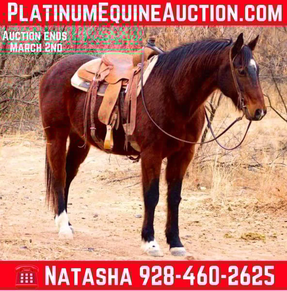 ONLINE AUCTION Place your bids at www.PlatinumEquineAuction.com Starting Bid $3500 Auction ends March 2nd, 2025 Need a new saddle? Check out White Rock Saddles on our website or Facebook! Captain is a 12 year old grade 1/4 draft cross gelding standing 15hh. Whether you’re looking for a real deal rough country ranch horse, your next magnificent trail partner to take you on countless adventures, or the perfect gymkhana jr. rodeo horse. Captain is broke and gentle that he will go absolutely any direction you decide point him. Trek through rough rocky terrain, ease through slick riverbeds, cross flowing waters, bulldoze through any brush, you name it and Captain will go through it with ease! This well versed gelding will also walk, trot, and lope both ways in the arena as well as neck rein and has good stop. Captain has done every job around the ranch and is no stranger to long days and wet saddle pads, making him absolutely safe and gentle for any level rider whether you’re 5 years old or 85 years old. Captain is easy to catch and good to groom, saddle, bridle, bathe, shoe, and load. UTD on shoes and floating as of 02/13/25. Will come with a clean coggins and health!! Located in Camp Verde, AZ Contact D/C Equine Services Dallas 804-822-2233 or Natasha 928-460-2625. ONLINE AUCTION Place your bids at www.PlatinumEquineAuction.com Starting Bid $3500 Auction ends March 2nd, 2025 Need a new saddle? Check out White Rock Saddles on our website or Facebook!