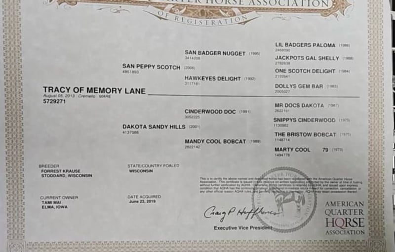 ONLINE AUCTION Place your bids at www.PlatinumEquineAuction.com Starting Bid $3500 Auction ends November 10th, 2024 Need a new saddle? Check out White Rock Saddles on our website or Facebook! Tracy Of Memory Lane is a 11-year-old registered AQHA Cremello mare that is suitable for the whole family she stands 15 hands tall and weighs approximately 1150 pounds. She has a lot of muscle and great confirmation she has a beautiful halter head with short ears. She has a deep heart girth and a big hip, all four straight legs and great hooves. Tracy‘s temperament is very docile and gentle. She is laid-back and sweet. Tracey loves attention. She has something for the whole family, she loves attention and is easy to catch. She is slow and confident for the little inexperienced ones and she is surefooted and very well broke for the experienced ones in the family. She has been shown in 4-H and has been ridden in parades during holidays. She has moved cattle on the farm and in the arena. Tracy is an excellent trail horse & has been rode on big trail rides such as Palo Dura Canyon and Matzel’s game reserve. She is used to wildlife, trucks, tractors, skid loaders and trains she has no spook or buck. She has no bad habits Tracy stands like a statue to mount and dismount whether it be from the ground or a mounting block. Tracy has no problems on trails with crossing water, ditches, logs or unlevel terrain. Her ground manners are impeccable. She is good with her feet. She hauls, clips and bathes like a statue. Tracy is 100% sound in every way, whether it be riding or breeding if you’re looking for a total package for the whole family, Tracy is dependable, gentle and surefooted. She’s also been used for lessons for multiple children and has also been used to pony other horses, truly sweet and sensible lots of videos and pictures available. Located in Lisbon, IA. Contact John McPhail 319-721-7714 with any questions. ONLINE AUCTION Place your bids at www.PlatinumEquineAuction.com Starting Bid $3500 Auction ends November 10th, 2024 Need a new saddle? Check out White Rock Saddles on our website or Facebook!